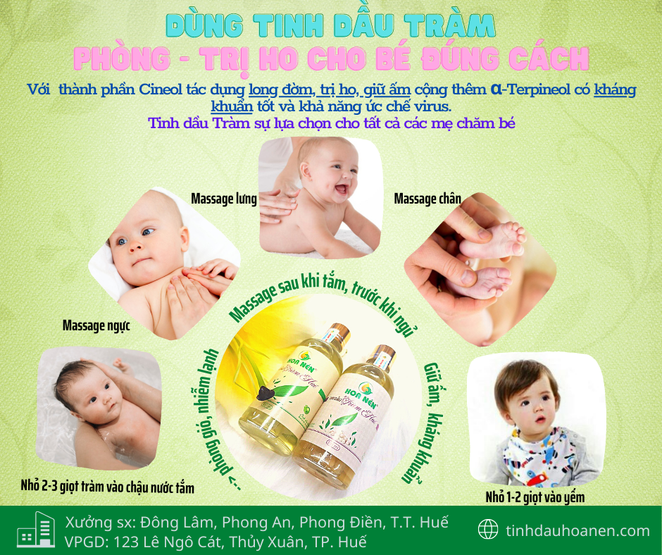 - Tinh dầu tràm phòng, trị ho, khò khè, long đờm: Dùng tinh dầu tràm thoa vào lưng (tránh thoa trực tiếp vào xương cột sống trẻ) giúp cơ thể trẻ ấm lên một cách tự nhiên và giữ ấm lúc về đêm. Khi trẻ bị lạnh, ho thường có triệu chừng xổ mũi, nghẹt mũi, thở dốc dẫn đến kém ăn, mất ngủ. Cho ít tinh dầu tràm vào khăn sữa rồi quàng vào cổ của bé; để trước mũi cho bé hít vào (không bôi trực tiếp lên mũi) hoặc nhỏ một vài giọt tinh dầu tràm vào gối nằm của trẻ, thoa vào 2 gan bàn chân trước lúc ngủ giúp bé không bị lạnh. Dùng tinh dầu tràm để xông họng, hít mũi, sử dụng đèn xông tinh dầu, máy khuếch tán sẽ giúp bé lưu thông mũi dễ dàng. Tinh dầu tràm có tác dụng làm tan đàm nhớt, trị ho hiệu quả.