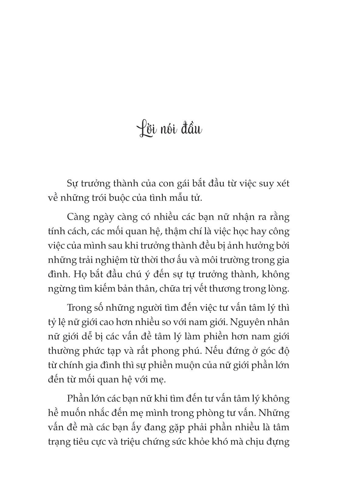 Có thể nói rằng: “Sự trưởng thành của con gái bắt đầu từ việc suy xét về những trói buộc của tình mẫu tử.” Trong số những người tìm đến việc tư vấn tâm lý thì tỷ lệ nữ giới cao hơn nhiều so với nam giới. Nguyên nhân ở đây chính là bởi các bạn nữ dễ bị các vấn đề về tâm lý làm phiền vì suy nghĩ của họ thường phức tạp và rất phong phú. Nếu đứng ở góc độ từ chính gia đình thì sự phiền muộn của nữ giới phần lớn đến từ mối quan hệ với mẹ.