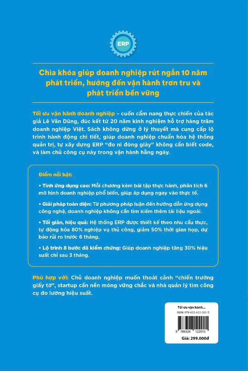 Cuốn sách Tối ưu vận hành doanh nghiệp là một bản đồ hành động giúp doanh nghiệp chuẩn hóa và số hóa toàn bộ hệ thống quản trị. Tác giả Lê Văn Dũng chia sẻ kinh nghiệm thực chiến suốt 20 năm qua, cô đọng thành 8 bước tối ưu vận hành và 10 bước thiết kế hệ thống ERP "đo ni đóng giày" cho từng doanh nghiệp. Sách trình bày rõ ràng các khái niệm cốt lõi như: đối tượng quản lý, danh mục và nghiệp vụ – từ đó giúp người đọc tự xây dựng quy trình quản lý không lỗ hổng, vận hành tinh gọn, tăng hiệu suất 30% chỉ sau 3 tháng áp dụng. Đi kèm là các ví dụ minh họa, mẫu biểu và phần mềm thực hành ERP trực tiếp. Cuốn sách không chỉ giúp bạn cải thiện vận hành mà còn là chìa khóa để nâng cao năng lực ra quyết định, mở rộng quy mô doanh nghiệp một cách bền vững