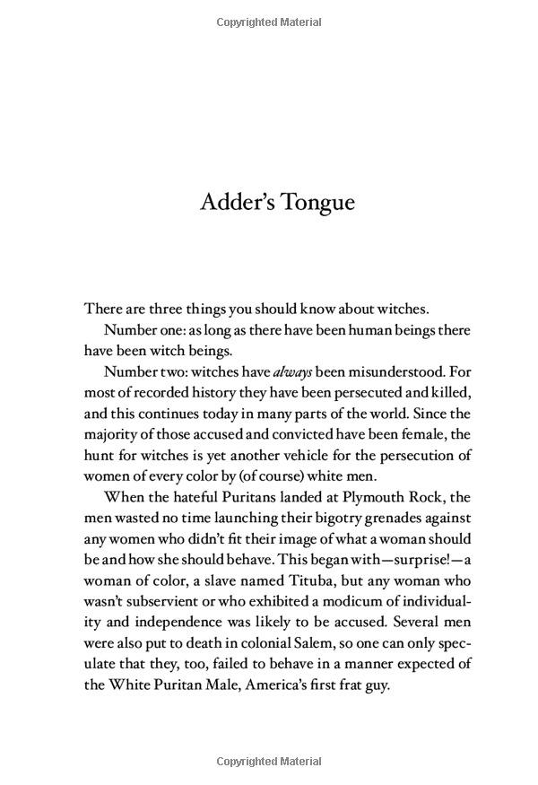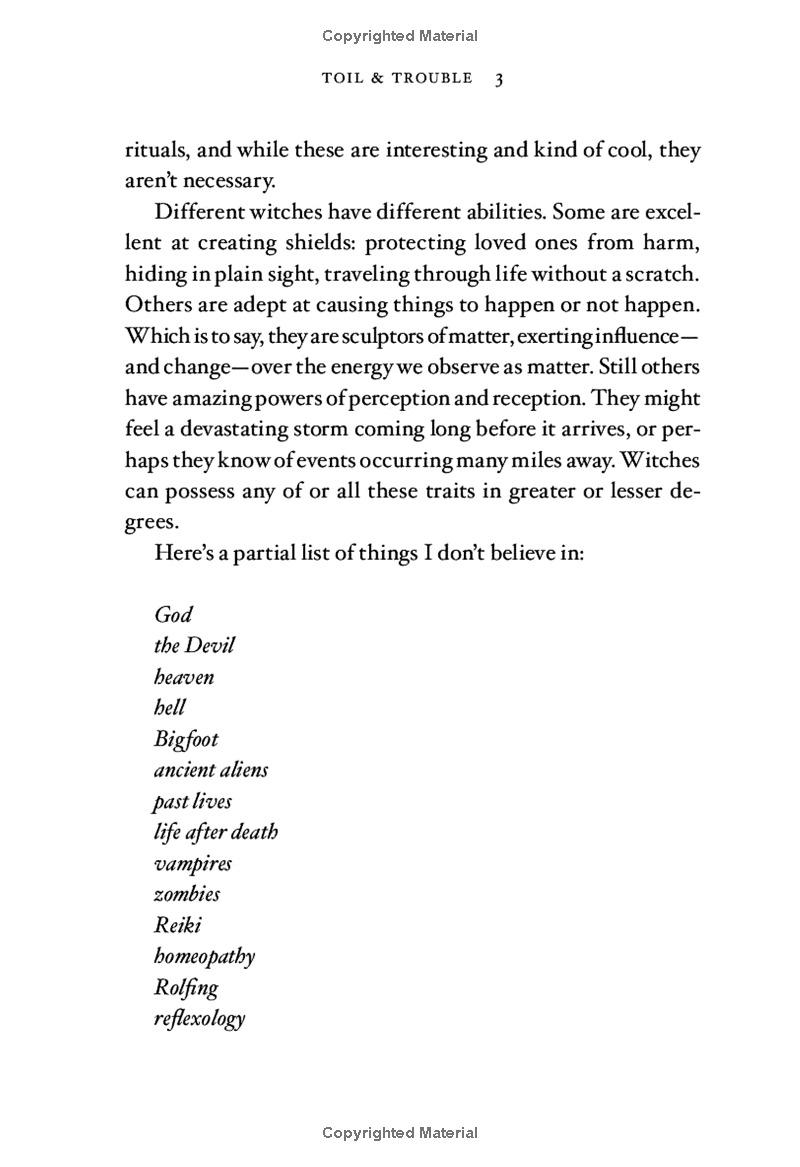 "Here’s a partial list of things I don’t believe in: God. The Devil. Heaven. Hell. Bigfoot. Ancient Aliens. Past lives. Life after death. Vampires. Zombies. Reiki. Homeopathy. Rolfing. Reflexology. Note that 'witches' and 'witchcraft' are absent from this list. The thing is, I wouldn’t believe in them, and I would privately ridicule any idiot who did, except for one thing: I am a witch."