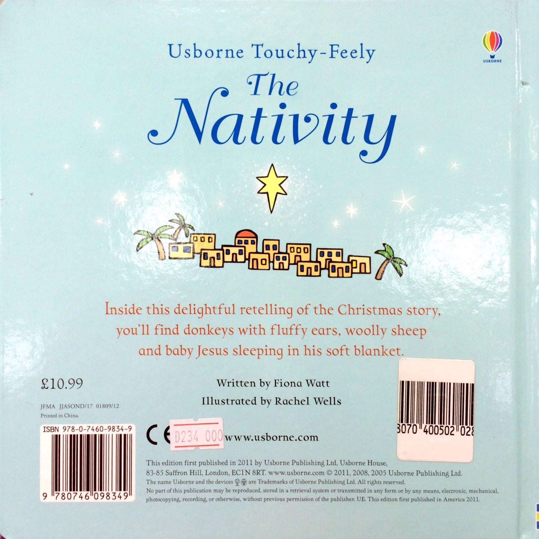 Carries EU Toy Safety Directive 'CE' logo. This is a gorgeous new Christmas edition from the popular and creative Usborne Touchy-Feely team. Charming illustrations by Rachel Wells accompany a tful, tactile retelling of the Christmas story, complete with fluffy donkeys, woolly sheep, a glittering angel and, of course, the baby Jesus sleeping in his soft blanket. This appealing large-format book makes the perfect present for young children who are experiencing Christmas for the very first time.