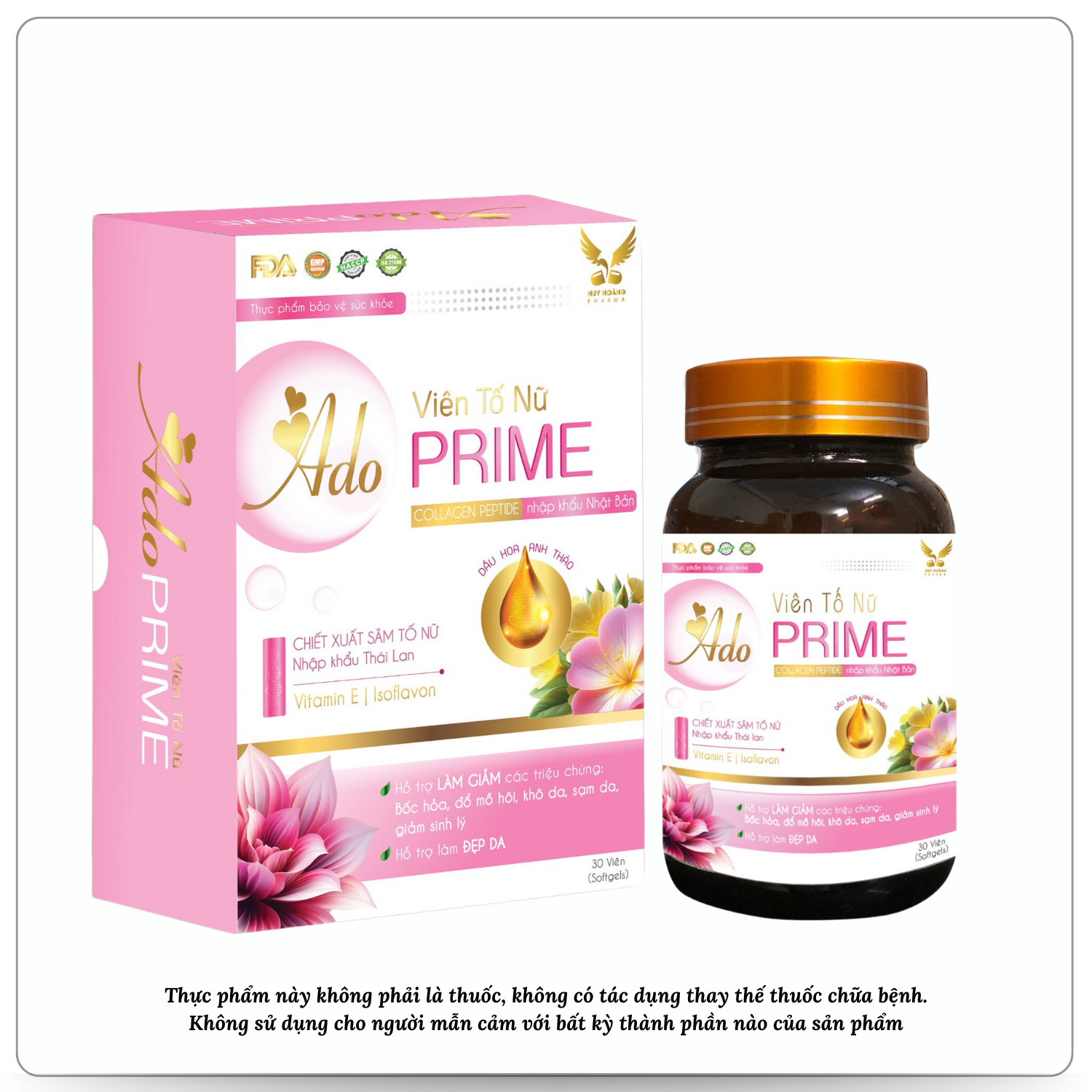 Ado Prime bổ sung isoflavon, collagen, vitamin E và một số chiết xuất thảo mộc, hỗ trợ làm đẹp da, hỗ trợ làm giảm các triệu chứng: bốc hỏa, đổ mồ hôi, khô da, sạm da, giảm sinh lý.