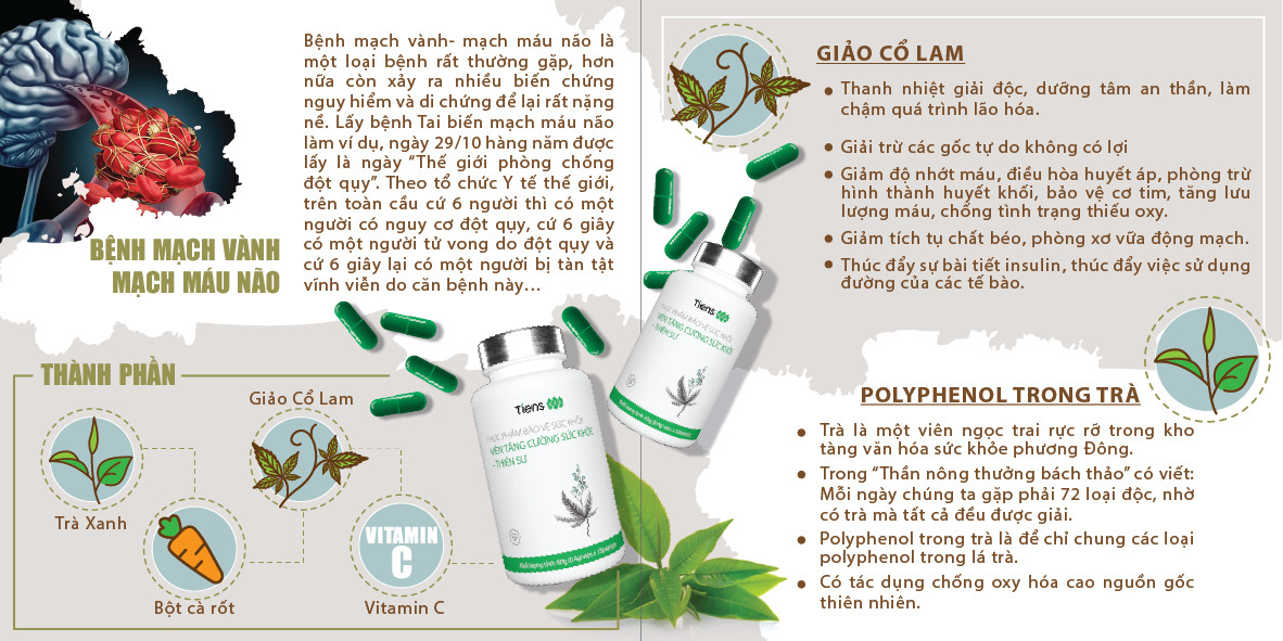 TPBVSK Viên tăng cường sức khỏe - Thiên Sư Quy cách: 60g (0.4g/viên x 150 viên)/lọ Thành phần: Bột cà rốt, chiết xuất giảo cổ lam, Polyphenol, Vitamin C Công dụng: Giúp hạn chế quá