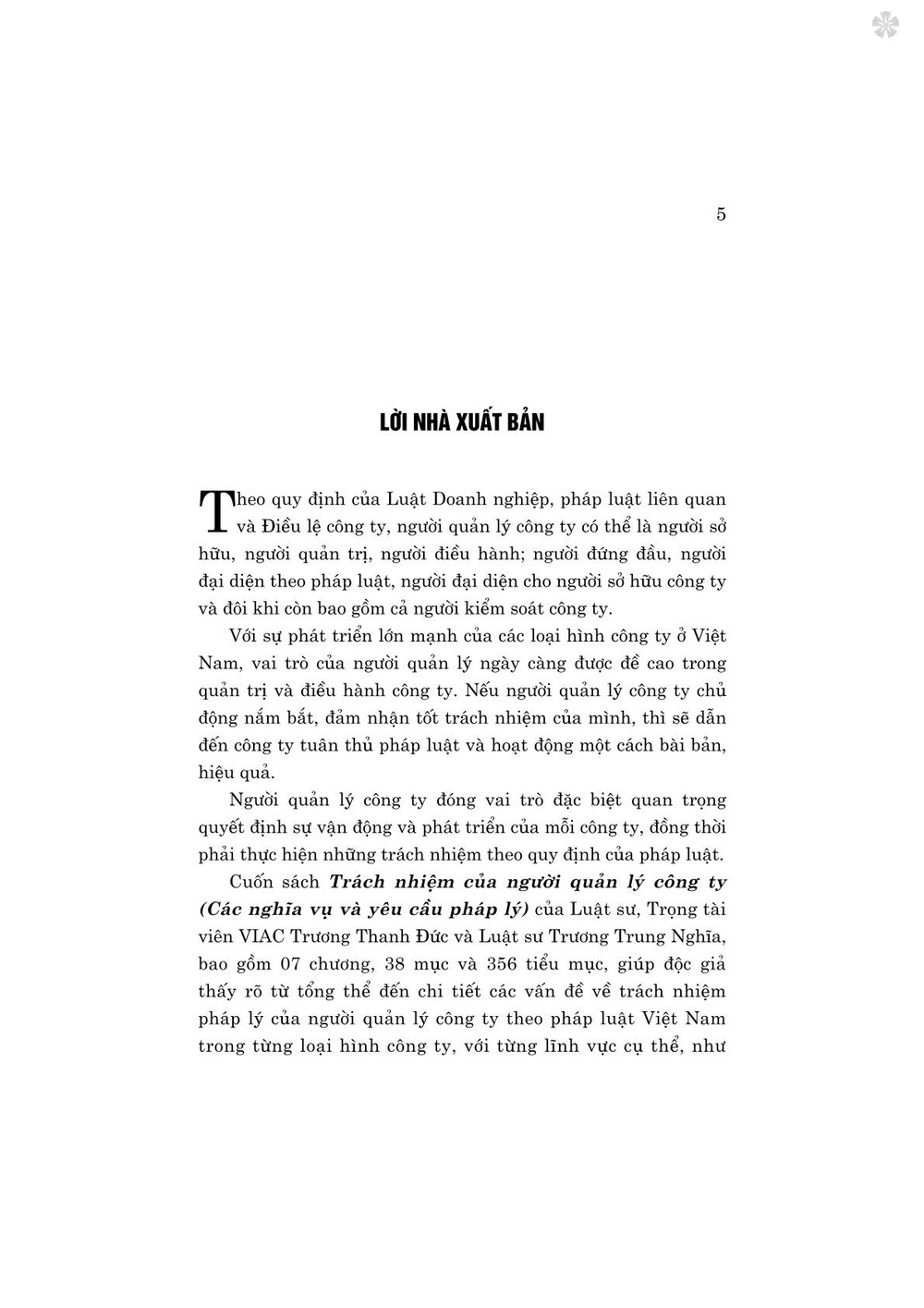 Mua tại TiktokNgười quản lý công ty đóng vai trò đặc biệt quan trọng quyết định sự vận động và phát triển của mỗi công ty, đồng thời phải thực hiện những trách nhiệm theo quy định của pháp luật. Cuốn sách Trách nhiệm của người quản lý công ty (Các nghĩa vụ và yêu cầu pháp lý) của Luật sư, Trọng tài viên VIAC Trương Thanh Đức và Luật sư Trương Trung Nghĩa, bao gồm 07 chương, 38 mục và 356 tiểu mục, giúp độc giả thấy rõ từ tổng thể đến chi tiết các vấn đề về trách nhiệm pháp lý của người quản lý công ty theo pháp luật Việt Nam trong từng loại hình công ty, với từng lĩnh vực cụ thể, như đầu tư kinh doanh, tài chính, ngân hàng, lao động, công nghệ và các lĩnh vực khác.