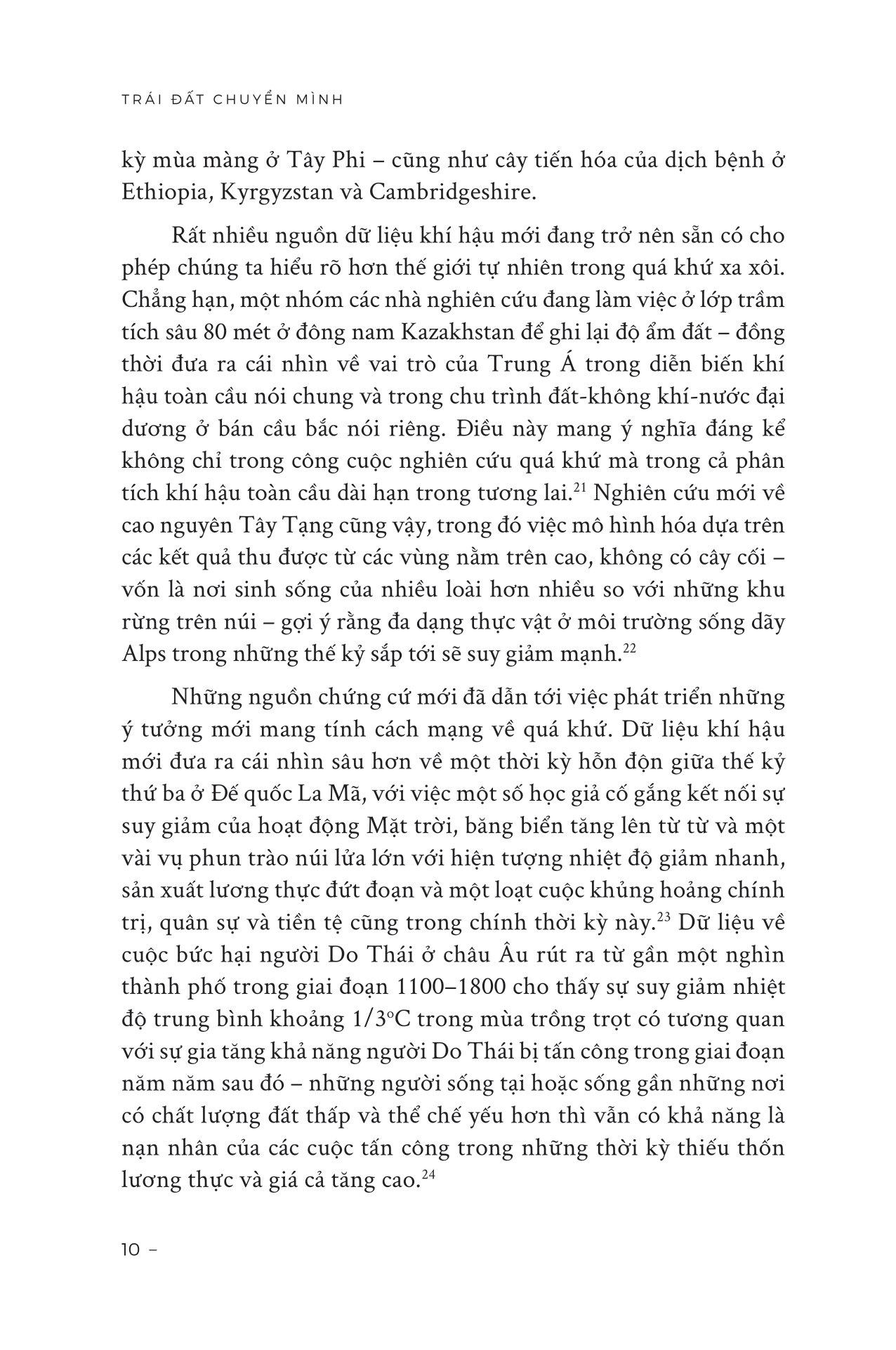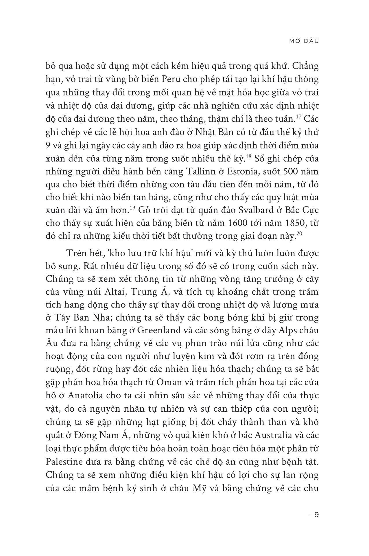 - Cuốn sách này không nói về những gì sẽ diễn ra trong tương lai. Mục đích của nó không phải để thách thức những tiếng nói đồng thanh mang tính áp đảo của cộng đồng khoa học, cũng không tập trung vào các điều kiện toàn cầu hiện tại hay xem xét những bước đi nào có thể giảm thiểu một số hoặc thậm chí là nhiều vấn đề tồi tệ nhất do biến đổi khí hậu đặt ra, dẫu là qua sự thích nghi hay giới thiệu những công nghệ mới. Thay vào đó, mục đích của nó là xem xét quá khứ, hiểu và giải thích chúng ta đã ở vào vị thế mà nay có vẻ thật hiểm nghèo như thế nào. Ban đầu, tôi nghĩ m.ình sẽ chỉ viết về lịch sử, rằng khí hậu đã định hình thế giới quanh ta như thế nào, và về những chiều hướng mà những biến chuyển trong nhiệt độ toàn cầu, lượng mưa và mực nước biển – cùng những hiện tượng cực đoan, như siêu bão, núi lửa phun trào và va chạm thiên thạch – đã ảnh hưởng lên quá khứ, sắp đặt nên những khoảnh khắc, những thời kỳ và bối cảnh giải thích vai trò quan trọng đến nhường nào của khí hậu trong lịch sử thế giới. Tuy nhiên, mọi sự rất sớm rõ ràng khi tôi bắt đầu nghĩ về một cuốn sách sẽ mở ra cánh cửa với khí hậu, với những thay đổi trong các kiểu quy luật thời tiết và với tác động của con người lên thế giới tự nhiên, nó sẽ dẫn tới một loạt câu hỏi và thách thức lớn hơn rất nhiều về mối quan hệ giữa dư thừa nông nghiệp và sự ra đời của nhà nước quan liêu; về mối liên quan giữa một bên là những người mục súc, du mục và bên kia là xã hội định canh định cư trong những ngôi làng, thị trấn và thành phố; về vai trò và sự phát triển của tôn giáo và các hệ thống tín ngưỡng như một hàm số của khí hậu, môi trường và địa lý; về c.hủng tộc và chế độ nô lệ, và vai trò của chúng trong quá trình khai thác các tài nguyên; về sự mở rộng của lương thực, mầm bệnh và bệnh tật; về chế độ dân chủ, nghèo đói và các mô hình tiêu thụ trong nhiều thế kỷ kể từ cách mạng công nghiệp; về toàn cầu hóa, tiêu chuẩn hóa của công nghiệp, nông nghiệp, lương thực và thời trang trong thế kỷ gần đây nhất; về nguyên do thế kỷ 21 rơi vào thời khắc khủng hoảng. Do đó cuốn sách này có ba mục đích. Thứ nhất là đưa khí hậu vào trong câu chuyện của quá khứ như một chủ đề cơ sở, mang tính cốt yếu và hay bị bỏ qua trong lịch sử toàn cầu, từ đó cho thấy ở đâu, khi nào và như thế nào mà thời tiết, các mô hình khí hậu kéo dài và những thay đổi trong khí hậu – do con người và do các nguyên nhân khác – lại có tác động to lớn đến thế giới. Thứ hai là trình bày câu chuyện về tác động của con người với thế giới tự nhiên qua nhiều thiên niên kỷ và xem xét cách thức loài người chúng ta khai thác, nhào nặn và uốn nắn môi trường theo ý chí của m.ình, cả mặt tốt lẫn mặt xấu. Và thứ ba là mở rộng tầm nhìn của chúng ta về lịch sử. Nghiên cứu về quá khứ từng bị thống trị bởi sự chú ý dành cho ‘thế giới phương bắc’, là những xã hội giàu có của châu Âu và Bắc Mỹ, còn lịch sử của các châu lục và khu vực khác thường bị xếp vào mức độ quan trọng thứ yếu hoặc bỏ qua hoàn toàn. Chính kiểu mẫu này cũng được áp dụng cho khoa học khí hậu và nghiên cứu về lịch sử khí hậu, nơi những khu vực rộng lớn, giai đoạn và con người nhận được ít sự chú ý, nghiên cứu hay đầu tư – nó nói lên nhiều điều về những quan điểm đã được chấp nhận từ lâu về quá khứ cũng như thực tế phát triển và hoạt động đào sâu vào thực tiễn của các quỹ học thuật (và các trung tâm trí thức). Nếu những điểm trên hướng đến một lý do căn bản để đánh giá lại lịch sử, thì sự nhấn mạnh quá mức của các sử gia rằng các thị trấn, thành phố và quốc gia giống nhau về sự lãnh đạo, bộ máy quan liêu và hành vi cũng cần như vậy. Thực vậy, bản thân từ ‘nền văn minh’ về nghĩa đen để chỉ đời sống của các thành phố, của những người sống trong nó và người phóng chiếu quyền lực và cai trị nó. Điều này được phản ánh trong hầu hết các tư liệu viết mang tính lịch sử – các bài tường thuật, các ghi chép về bán đất, các hóa đơn thuế, – phục vụ cho việc củng cố sự cai trị theo tôn ti thứ bậc. Rất nhiều nội dung lịch sử được viết bởi những người sống ở các thành phố, cho những người sống ở thành phố, và tập trung vào đời sống của những người sống ở thành phố. Việc đó làm lệch đi cách ta xem xét quá khứ và thế giới quanh m.ình. - Trích trang 28