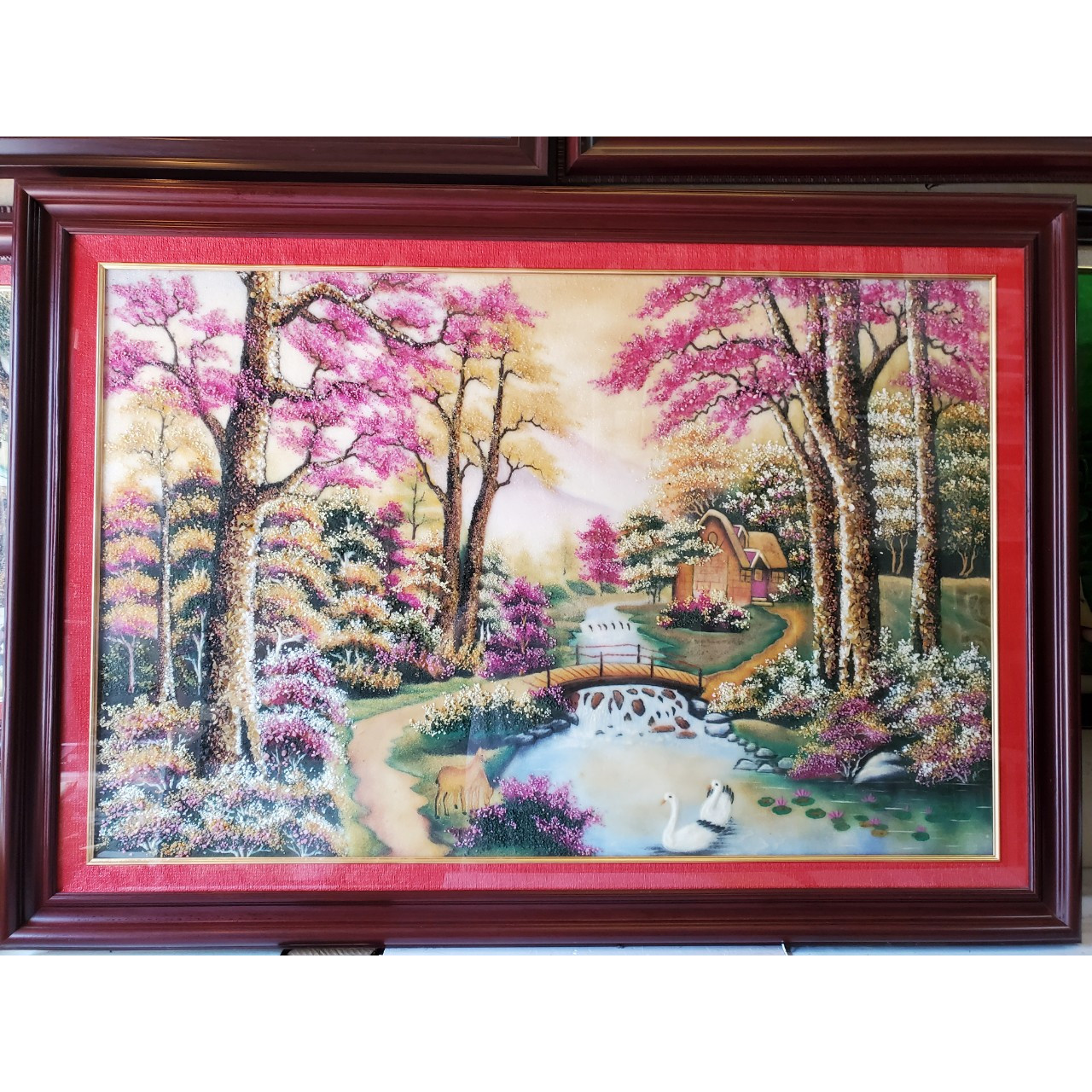 Mặt tranh được bảo vệ lớp kính hoặc mika trong.