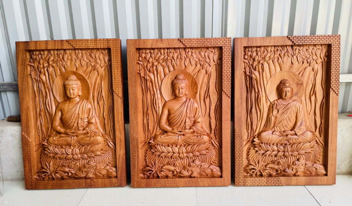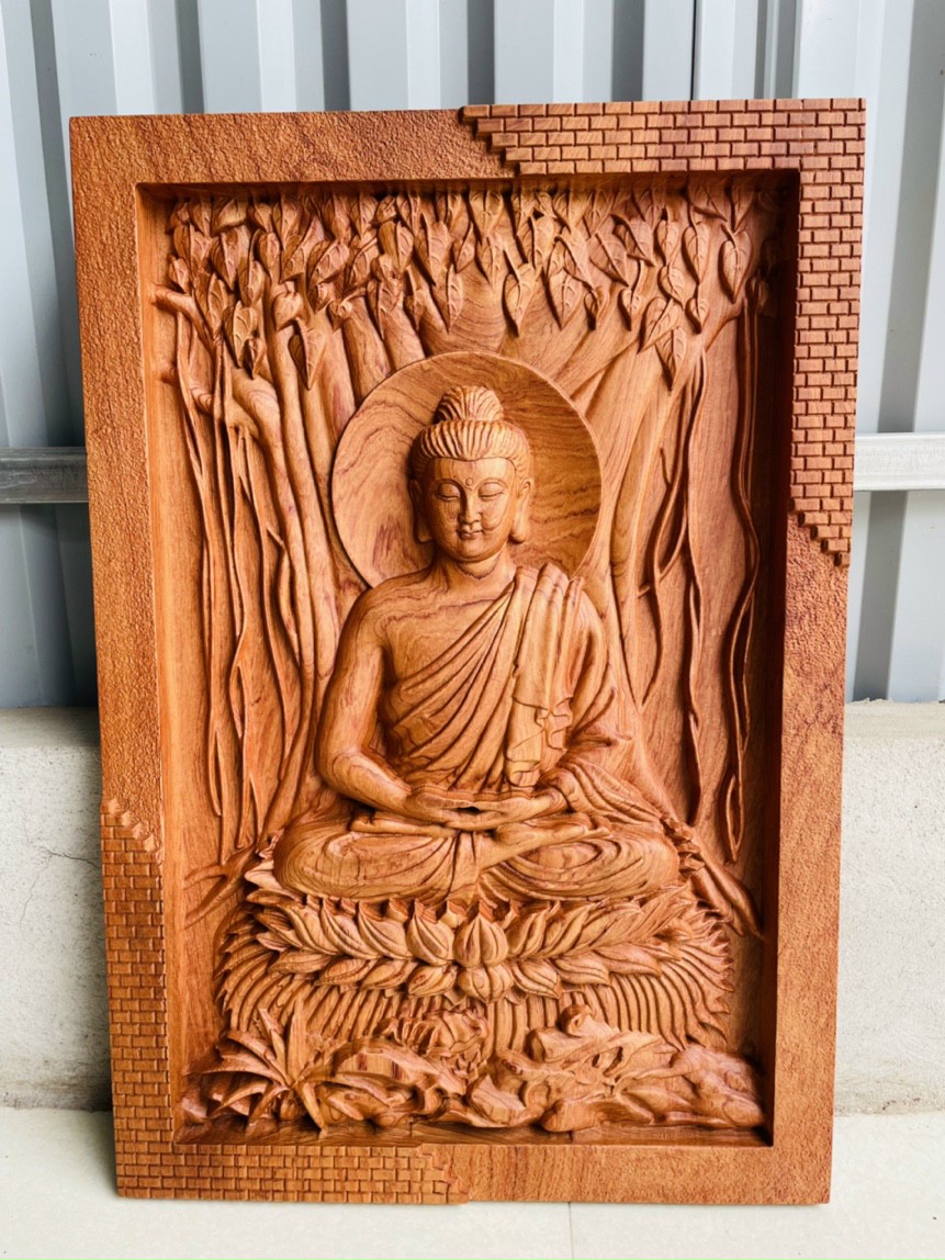 Tranh phật thích ca và phật adi đà được làm bằng chất liệu gỗ hương đá liền khối tự nhiên 100% Kt 46×67×4cm _ Tranh phật thích ca được trạm khắc vô cùng tỉ mỉ ,tinh sảo kỳ công .Đi hầu hết tất cả mọi chi tiết góc ngách nội dung hoa văn của tượng đều được gọt tỉa sắc nét ,như mắt mũi thần thái ,mặt phúc hậu và các chi tiết nhỏ như quân áo tay chân của phật , hoàn toàn bằng tay thủ công .Đồng thời tranh được kiểm định kỹ lưỡng khắt khe ,như cho vào thẩm sấy cho gỗ khô kiệt ,Mục đích trống dập nứt vênh mo mối mọt kết hợp với trà nhám ,đánh giấy giáp nhiều nước sờ mát lạnh ,Song rồi cho vào phun lót làm bóng mờ để giữ lại mầu sắc vân gỗ tự nhiên .Tranh phật thích ca được làm và hoàn thiện ,do bàn tay khối óc tài hoa ,Từ những người thợ dầy rặn kinh nghiệm ,Cũng như tay nghề cao trong làng nghề truyền thống .Chính vì thế tranh phật đã đáp ứng đầy đủ mọi tiêu trí cần thiết ( Đẹp bền rẻ ) Thẩm mỹ nghệ thuật với chất lượng tuyệt vời
