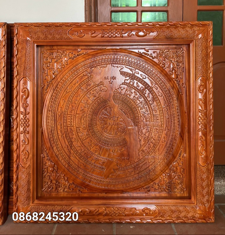 _ Tranh điêu khắc trống đồng đông sơn và giải hình chữ s bản đồ Việt Nam, được làm bằng bằng chất liệu gỗ hương đỏ tự nhiên 100% _ Kt mặt vuông 97×97×5cm _