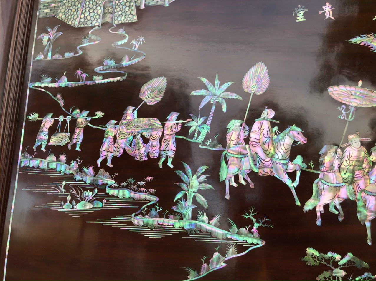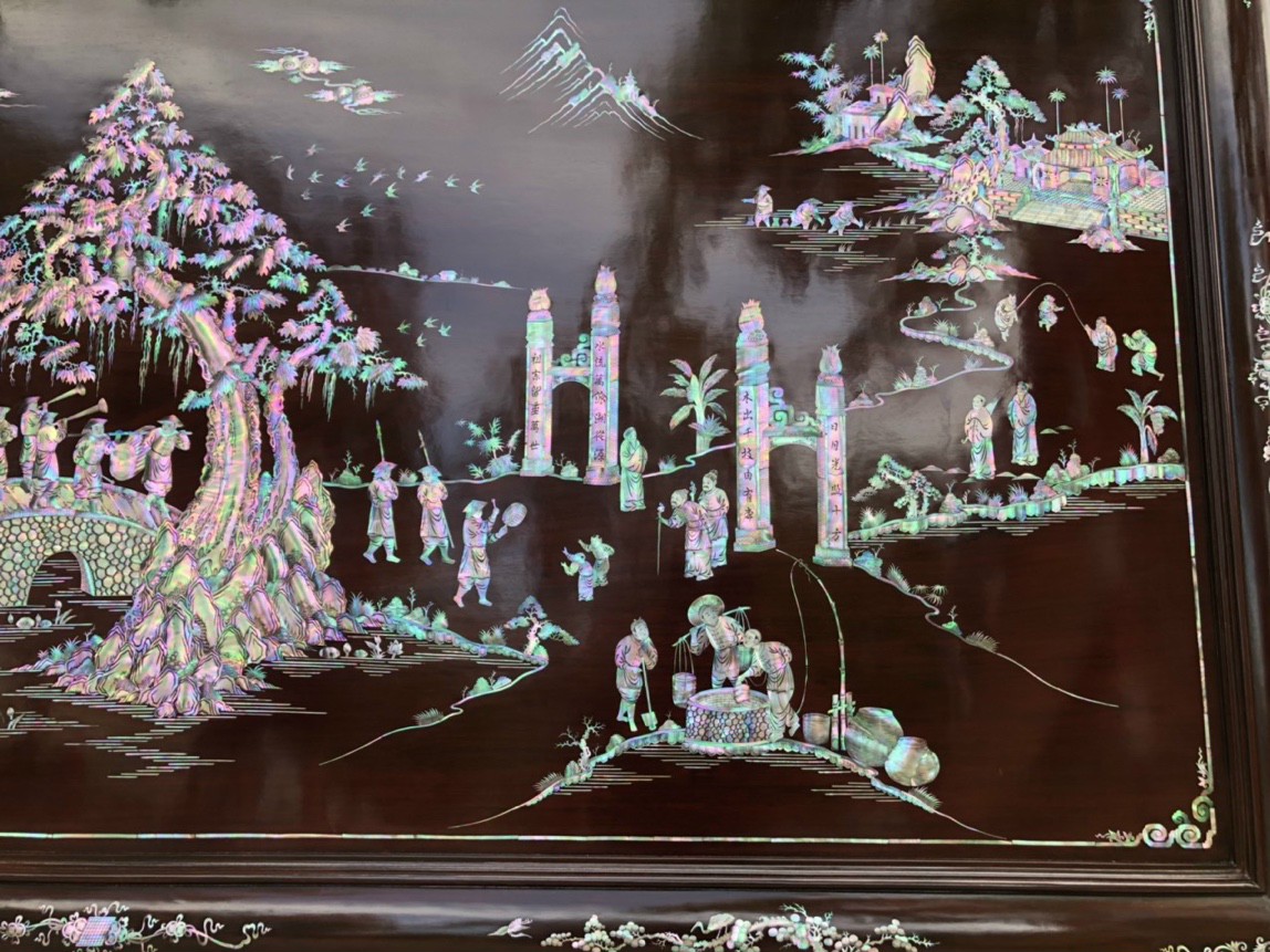 _ Tranh vinh quy bái tổ được cắt tỉa từng chi tiết xà cừ ốc đỏ ,lặp ghép vào với nhau vô cùng công phu, tinh sảo ,kỳ công .Đi hầu hết tất cả mọi đường nét đều được gọt tỉa chỉnh sửa hoàn toàn bằng tay thủ công .Đồng thời ván tấm gỗ gụ được kiểm định kỹ lưỡng như cho vào tắm nước vôi ,rồi cho vào sấy gỗ khô kiệt ,Mục đích trống dập nứt vênh mo ,mối mọt ,Kết hợp với trà nhám đánh ,giấy giáp nhiều lần ,sờ mát lạnh ,song rồi nhuộm mầu mận chín đánh vétly làm mầu mận chín giả cổ ,Tranh vinh quy được làm và hoàn thiện do bàn tay khối óc tài hoa ,Từ những người thợ giàu kinh nghiệm ,cũng như các nghệ nhân có tay nghề cao trong làng nghề truyền thống .Chính vì thế tranh vinh quy bái tổ đã đáp ứng đầy đủ những tiêu trí ( Đẹp bền rẻ ) Thẩm mỹ nghệ thuật với chất lượng hoàn hảo