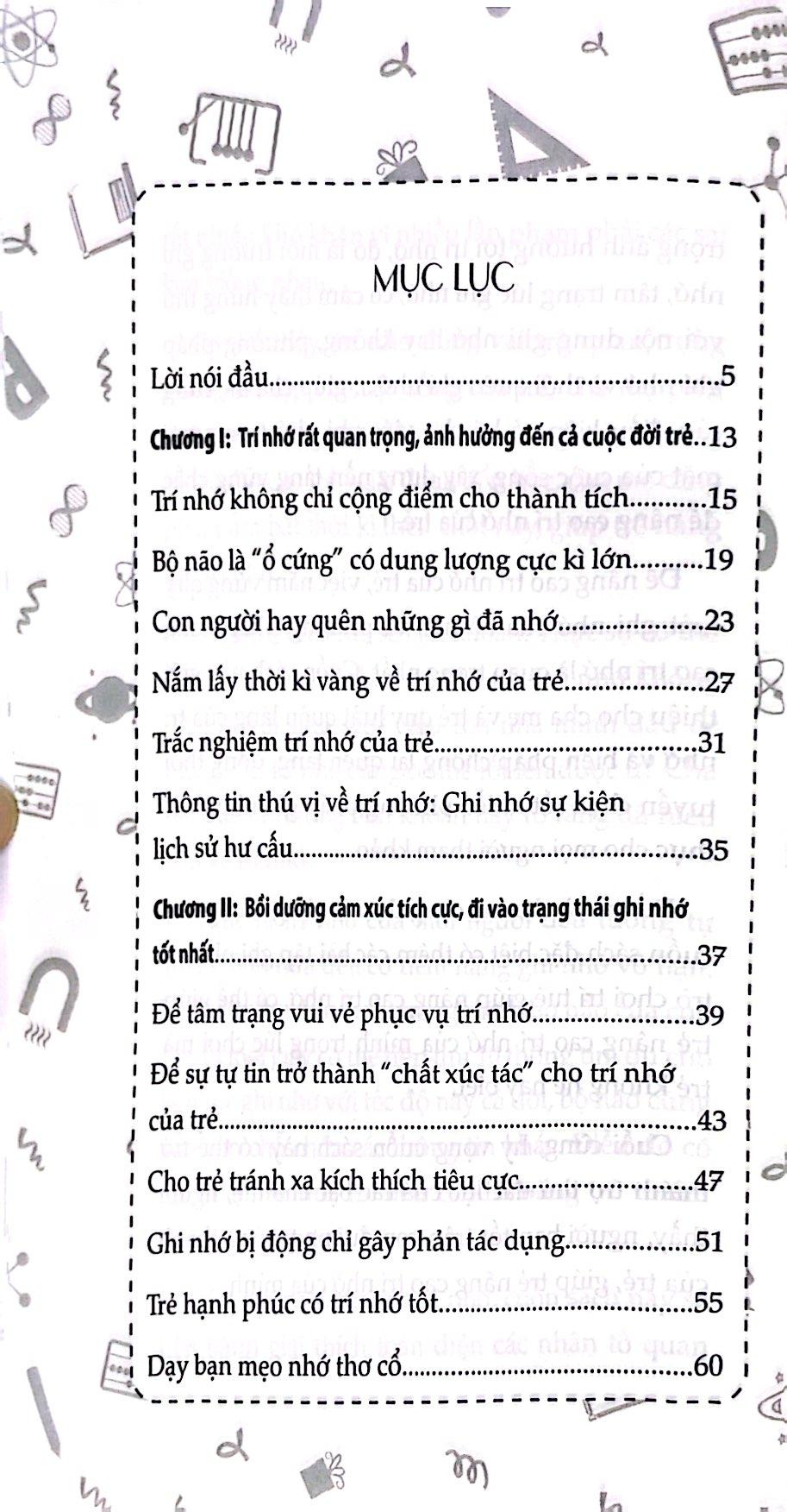 Đặc biệt cuốn sách còn cung cấp thêm 39 bài tập ghi nhớ và vai trò chơi rèn luyện trí nhớ ,để cho mẹ cùng tương tác với trẻ hy vọng cuốn sách này sẽ trở thành trợ thủ đắc lực của các bậc cha mẹ, người thầy người bạn tốt trên con đường trưởng thành của trẻ giúp trẻ khai thác tốt nhất .