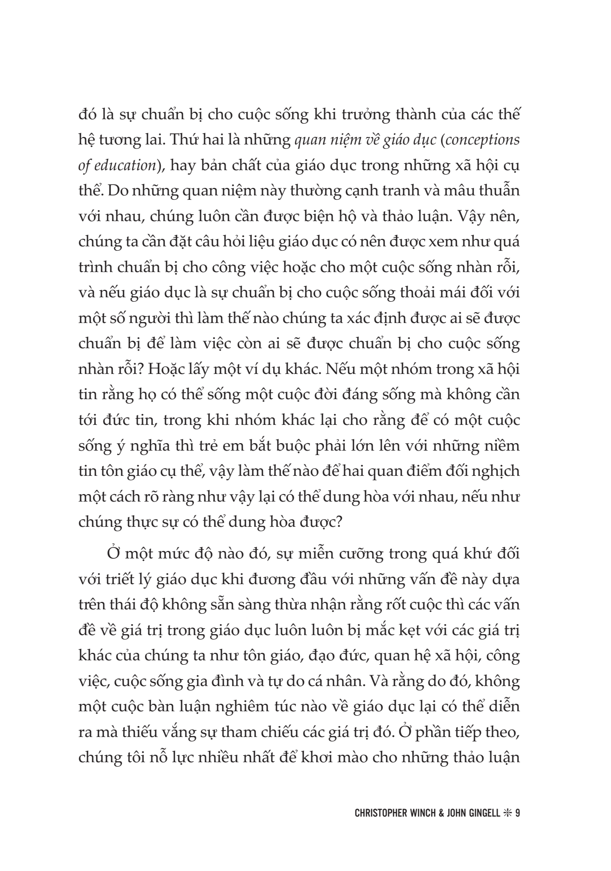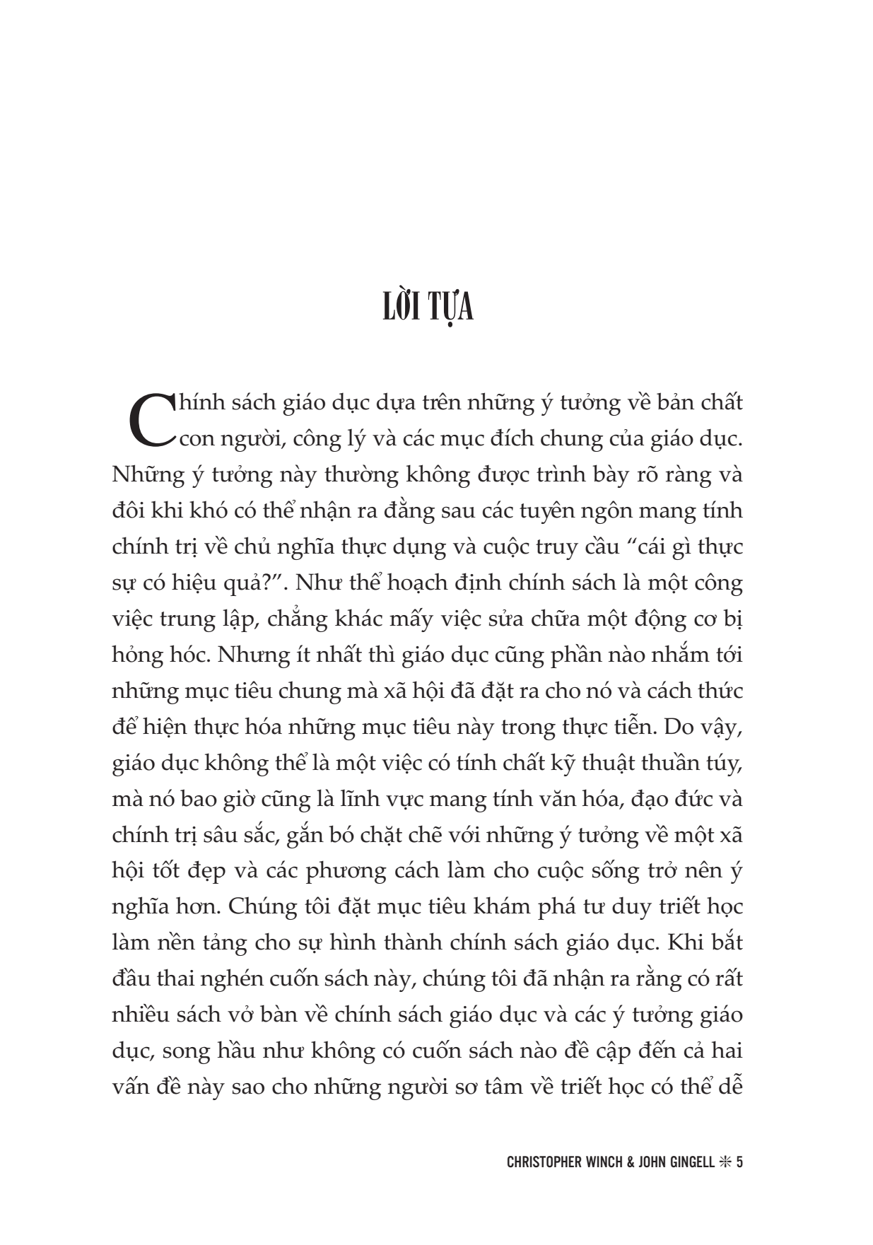 Hai tác giả Winch và Gingell bắt đầu với việc tiếp cận từ mục tiêu của giáo dục, chương trình giáo dục, thực tiễn dạy và học cho tới hàng loạt vấn đề thu hút sự quan tâm của công chúng như kiểm tra đánh giá, thành tích, giáo dục công dân, hướng nghiệp, yếu tố chính trị và kinh tế thị trường trong giáo dục. Những khía cạnh này cung cấp cho chúng ta nền tảng để hiểu thế nào là triết lý giáo dục, nó được cấu thành từ những bộ phận nào và vận hành ra sao, và nó đã tác động như thế nào tới việc hoạch định chính sách giáo dục của một quốc gia hay một cộng đồng xã hội. Mỗi thành tố ngoài được phân tích, mổ xẻ, so sánh, liên hệ giữa các hệ thống xã hội khác nhau, còn được đặt trong tương quan với các quan niệm đã có từ quá khứ, từ đó giúp độc giả có cái nhìn sâu sắc. Ngoài ra, mỗi chương sách có một phần Câu hỏi thảo luận mang tính chất gợi mở những suy tưởng sâu hơn cùng với một Danh mục tài liệu đọc thêm bổ trợ cho công tác nghiên cứu khoa học giáo dục.