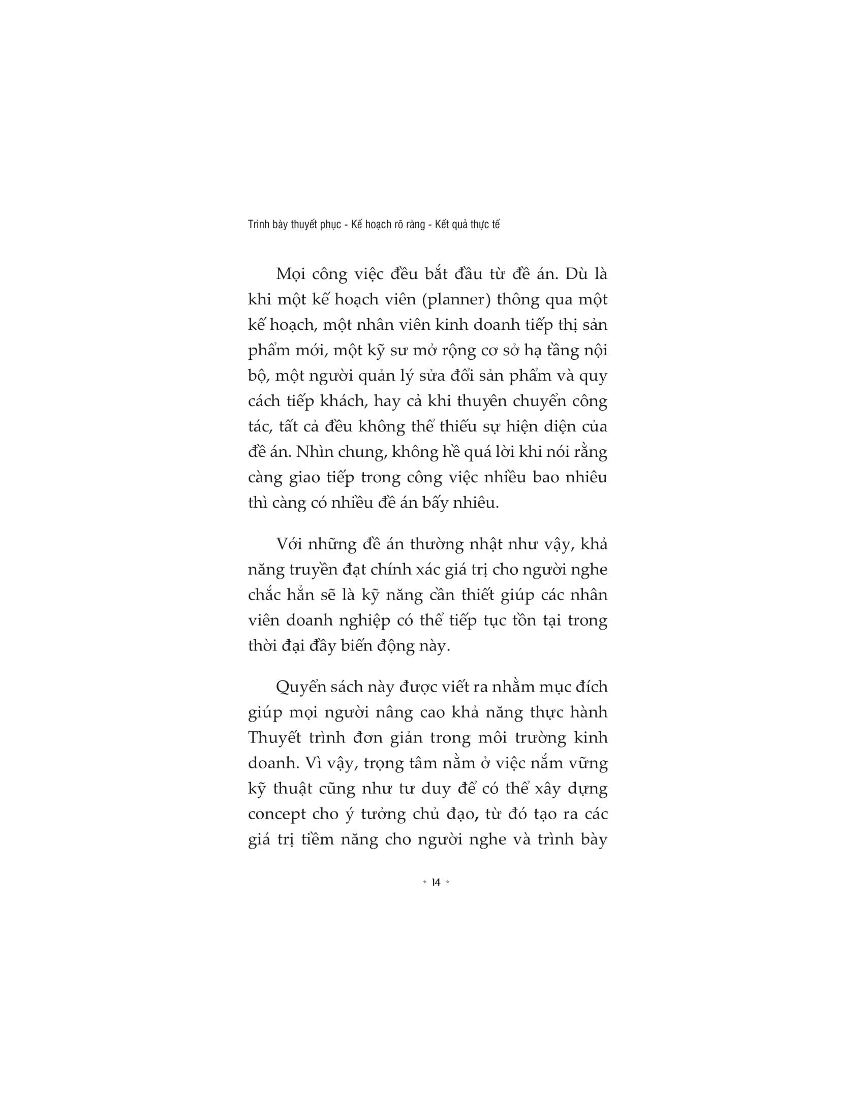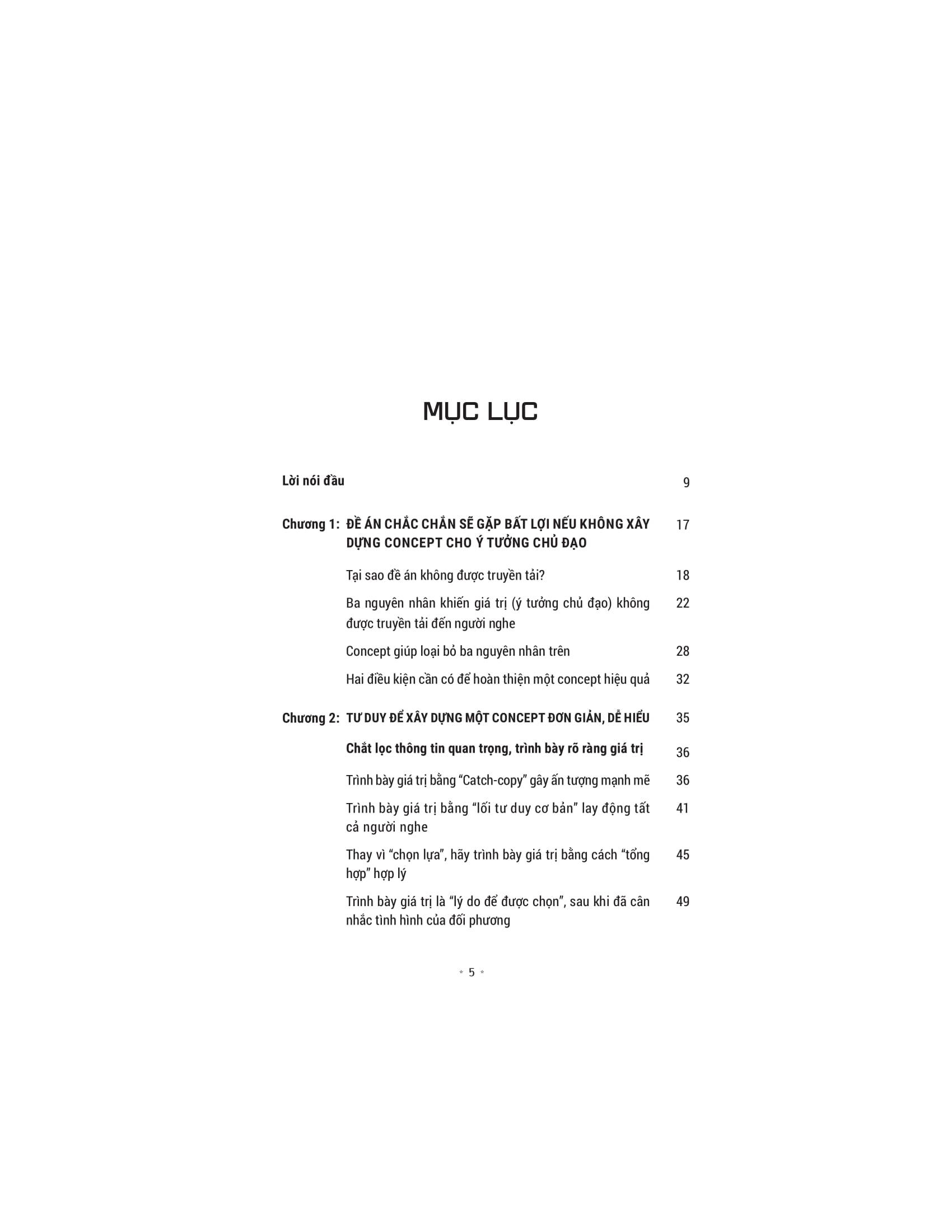 Chìa khóa cho vấn đề nằm ở việc nắm vững tư duy cũng như kỹ thuật để xây dựng ý tưởng chủ đạo, tạo ra các giá trị tiềm năng cho người nghe, đồng thời truyền tải chúng một cách ngắn gọn nhưng hiệu quả. Khi trình bày thuyết phục rành mạch, với kế hoạch rõ ràng xác đáng cùng kết quả thực tế khả thi, chắc chắn đề xuất của bạn sẽ dẽ dàng “chạm đích”. Cuốn sách với sáu chương ngắn gọn tập trung vào một kỹ thuật được gọi là «Thuyết trình đơn giản », một kỹ thuật cân bằng giữa việc tạo ra giá trị hấp dẫn và việc trình bày nó một cách rõ ràng dễ hiểu.