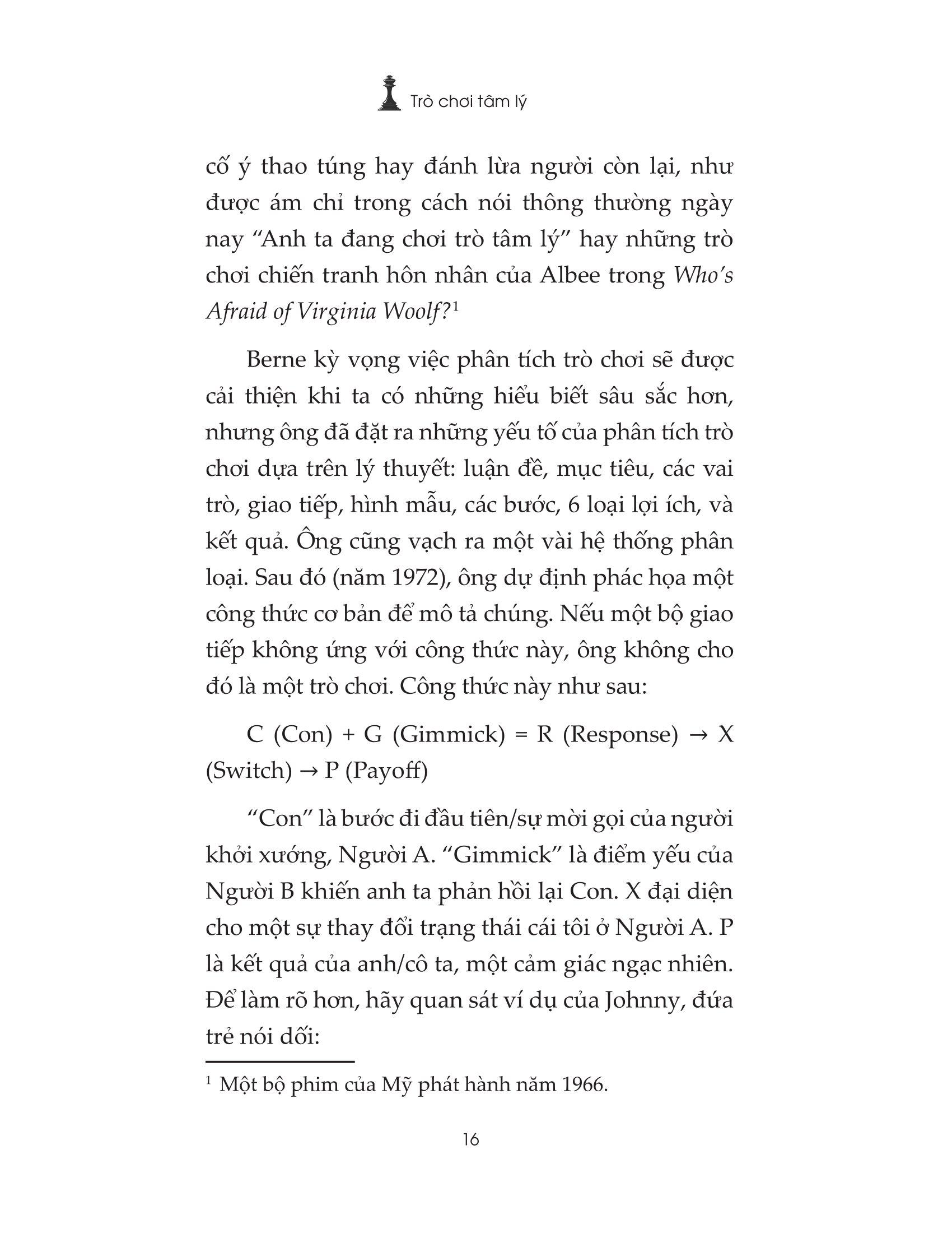 “Trò chơi tâm lý” là một cuốn sách kinh điển về hành vi của con người, giải thích những trò chơi tâm lý hoang dã và thú vị mà bạn và mọi người xung quanh bạn chơi để thao túng lẫn nhau đồng thời cũng đưa ra các cách chế ngự bản ngã của m.ình để bạn có thể ngừng chơi với những mối quan hệ độc hại và tận hưởng những mối quan hệ lành mạnh hơn.