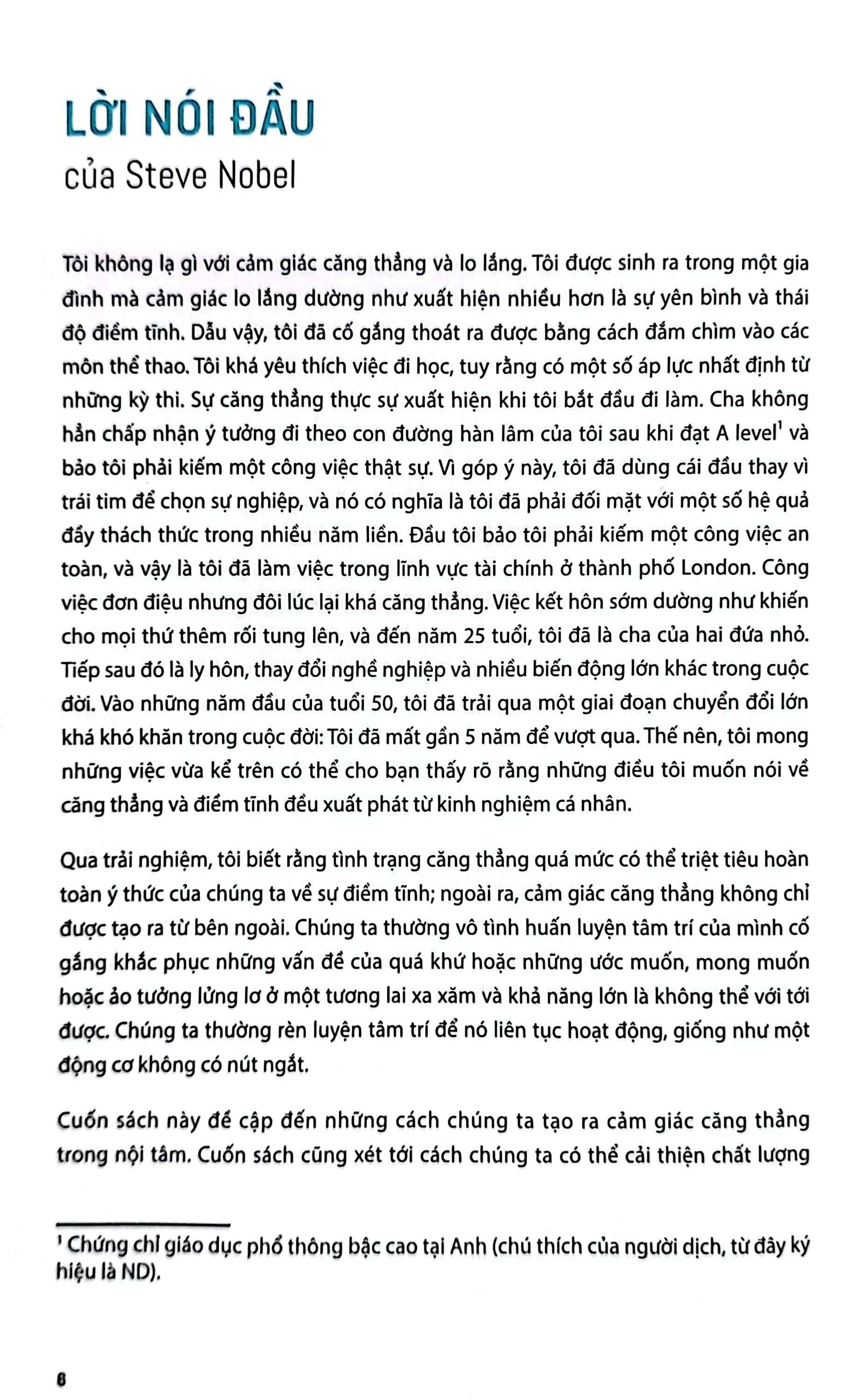 Nguyên tắc cơ bản của cuốn sách này là sẽ là sai lầm nếu coi căng thẳng là điều không thể tránh được: lo lắng không phải là một phần của bản thân, nó là một phản hồi, và giống như tất cả các phản hồi khác, nó nằm trong khả năng kiểm soát của mỗi người. Chúng ta có thể chọn trở nên điềm tĩnh.