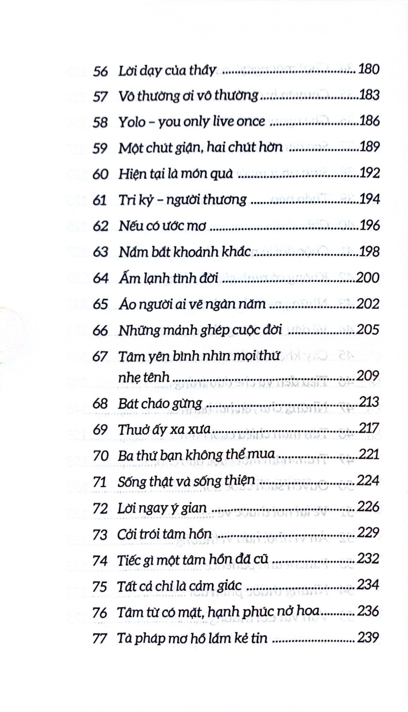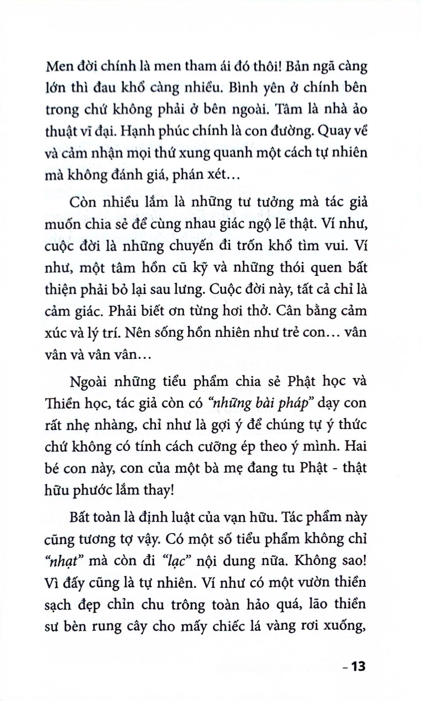 “Những gì tôi làm, tạm gọi là quá trình chữa lành mà bất kỳ ai cũng có thể làm được, là quay về sống trọn vẹn từng khoảnh khắc, lắng nghe từng hơi thở, cảm nhận từng bước đi và ghi nhận các cảm thọ đang có mặt, hay nói đúng hơn là quay về học cách hiểu chính m.ình. Ai trong chúng ta cũng có thể làm điều đó, quan trọng là chớ để bị vướng mắc vào cảm xúc ghét thương. Khi bị cảm xúc tiêu cực chi phối, vết thương trong lòng m.ình sẽ càng ăn sâu và tâm hồn sẽ không còn đủ chỗ cho lòng vị tha, bi mẫn. Xin hãy xem m.ình như nắm cát trong tay hay lá cỏ ven đường, dù nhỏ bé, mong manh nhưng vẫn tràn đầy sức sống, luôn sẵn sàng đón ánh mặt trời trong buổi sớm mai.”