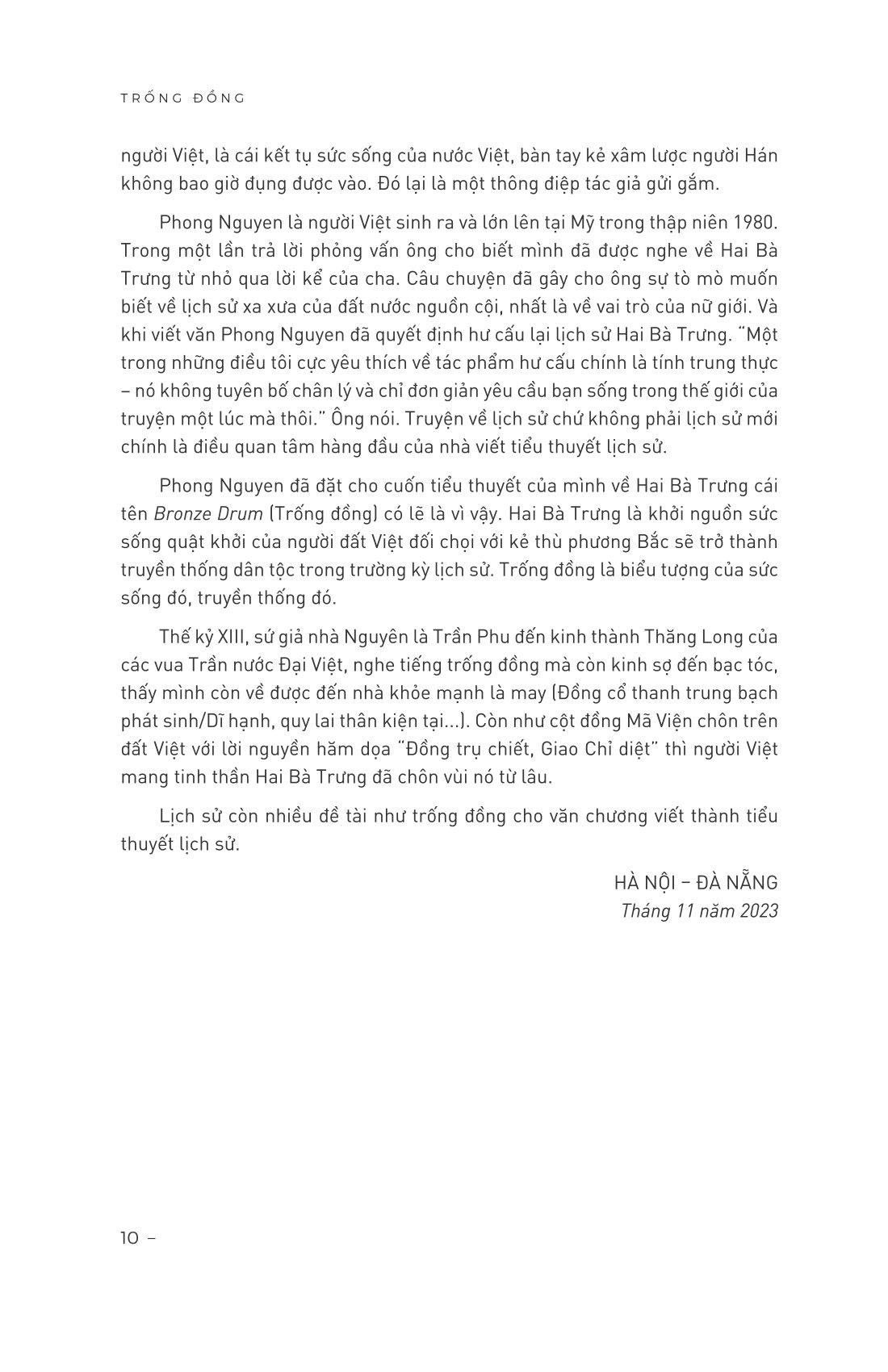 Với phần đông các độc giả Việt thì câu chuyện khởi nghĩa của Hai Bà Trưng đã được biết đến rộng rãi thông qua những bài học ở trường từ thuở nhỏ, nhưng những thông tin được biết đến khá ít ỏi và hạn hẹp. Vậy nên, với “Trống đồng” của Phong Nguyen, chúng ta như được hòa m.ình vào “một cuộc phiêu lưu lịch sử hấp dẫn” về Việt Nam thời cổ đại dựa trên câu chuyện lịch sử về hai chị em Trưng Trắc – Trưng Nhị, với trọng tâm là cuộc nổi dậy nhằm lật đổ ách cai trị của nhà Hán.
