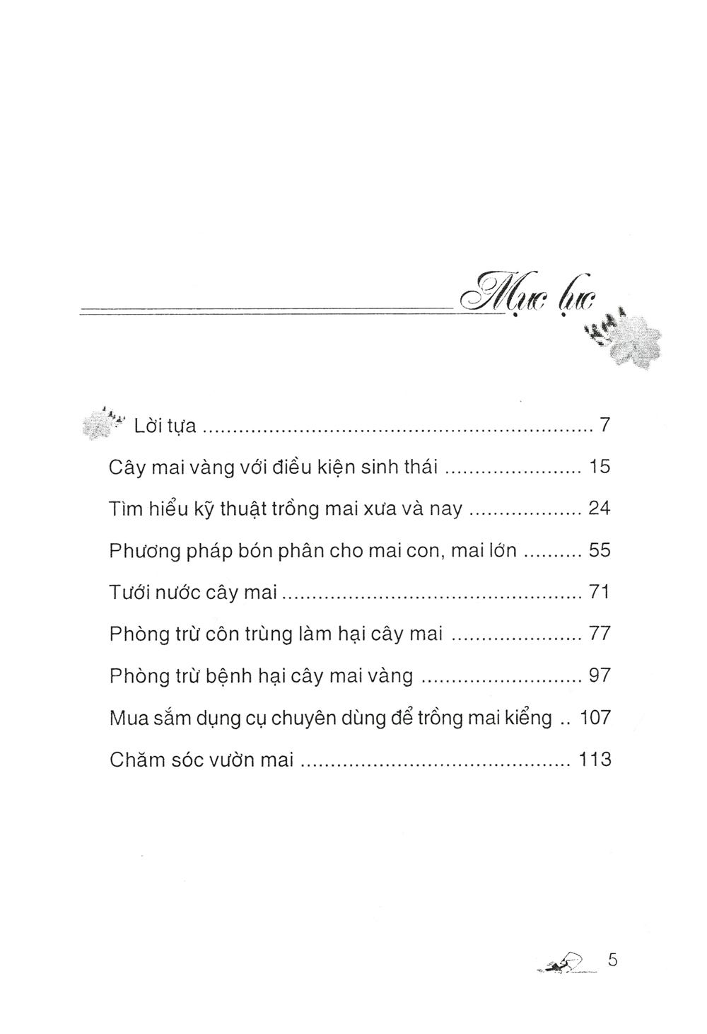 Muốn trồng được những cây mai đẹp đạt giá bán cao ngất ngưỡng như vậy, người làm vườn, tức là nghệ nhân hoa kiểng phải dày công chăm sóc tưới bón, và hằng ngày quan tâm đến việc phòng trị các loài sâu rầy và bệnh hại cho cây. Cuốn sách giới thiệu về kỹ thuật trồng, cách chăm sóc, tưới nước, phòng trừ côn trùng - bệnh hại cho cây mai.