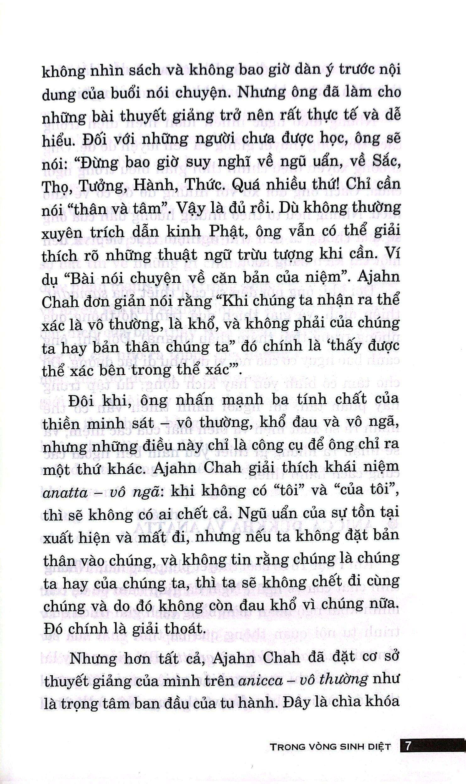 Trong vòng sinh diệt tập hợp những bài thuyết giảng của Ajahn Chah do Paul Breiter biên tập, sẽ mang lại cho chúng ta cái nhìn rõ hơn về các ý niệm vô thường và vô ngã trong Phật giáo. Theo Ajahn Chah, hiểu về lẽ vô thường là trọng tâm ban đầu của quá trình tu tập. Đây là chìa khóa để mở ra cánh cửa dẫn chúng ta vào hành trình tâm linh.