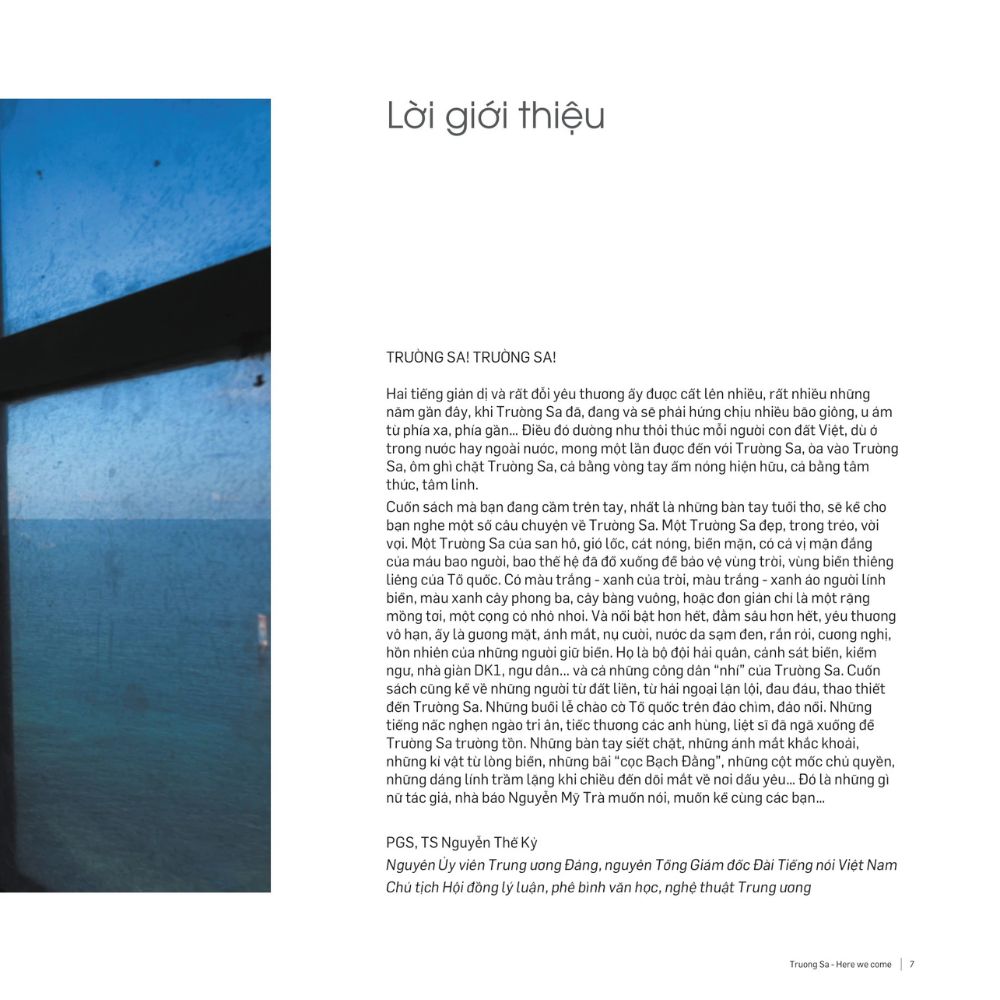 “To assert Vietnam’s sovereignty over Truong Sa (Spratly) islands, generations after generations of Vietnamese civilians and armed forces have erected various border posts from iron, steel, concrete as well as other materials. There are, however, much more resilient sovereignty markers that neither wave nor storm could weather. They exist in the sacrifices of countless navy soldiers, in music, literature, artistic photos, etc. “Truong Sa - Here we come”, the book by journalist Nguyễn Mỹ Trà you are holding, can also be considered a valuable declaration of the country’s indisputable rights over its sacred territorial waters and maritime features.” - Tran Dang Khoa, poet.