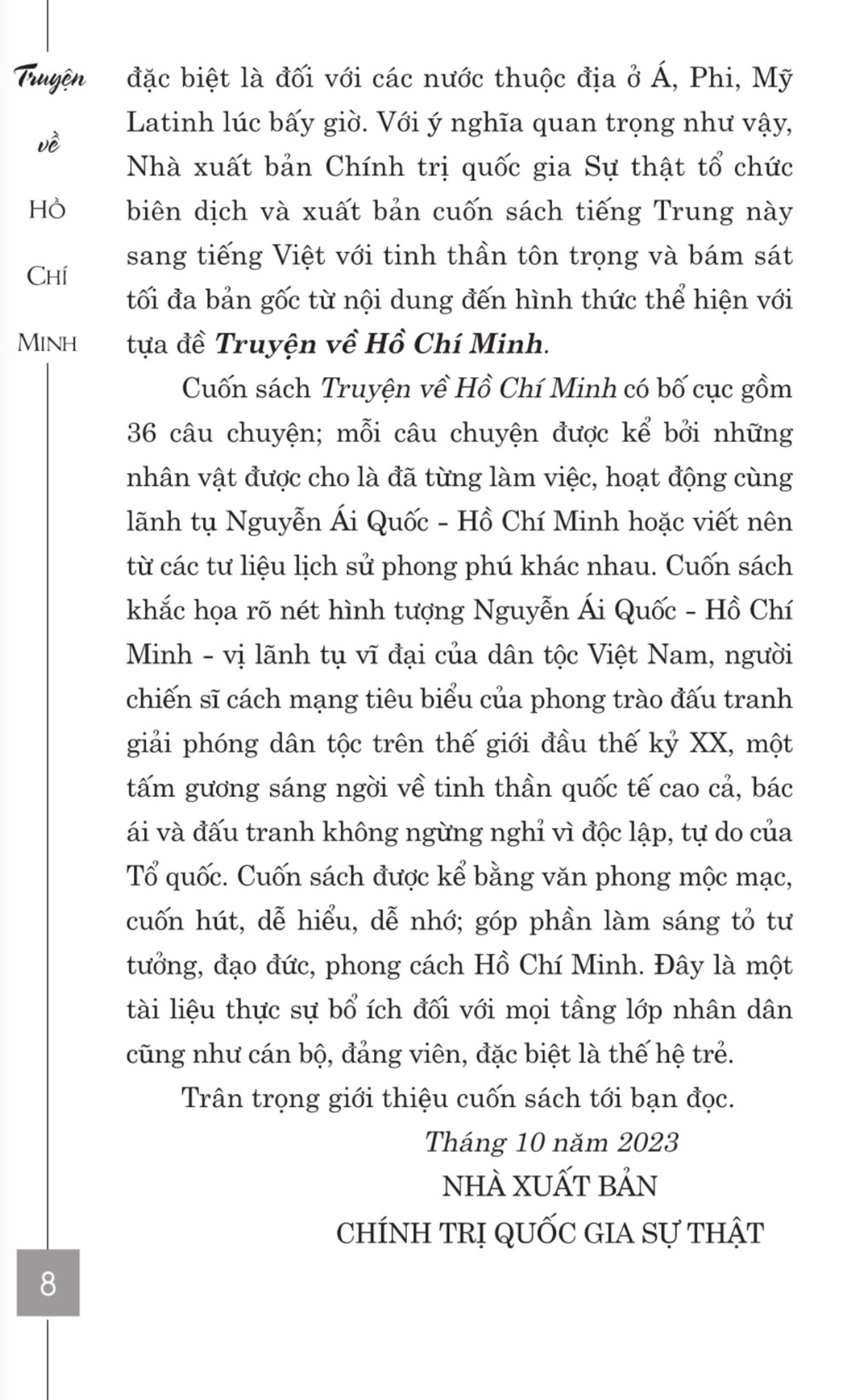 Cuốn sách khắc họa rõ nét hình tượng Nguyễn Ái Quốc - Hồ Chí Minh - vị lãnh tụ vĩ đại của dân tộc Việt Nam, người chiến sĩ cách mạng tiêu biểu của phong trào đấu tranh giải phóng dân tộc trên thế giới đầu thế kỷ XX, một tấm gương sáng ngời về tinh thần quốc tế cao cả, bác ái và đấu tranh không ngừng nghỉ vì độc lập, tự do của Tổ quốc. Cuốn sách được kể bằng văn phong mộc mạc, cuốn hút, dễ hiểu, dễ nhớ; góp phần làm sáng tỏ tư tưởng, đạo đức, phong cách Hồ Chí Minh. Đây là một tài liệu thực sự bổ ích đối với mọi tầng lớp nhân dân cũng như cán bộ, đảng viên, đặc biệt là thế hệ trẻ.