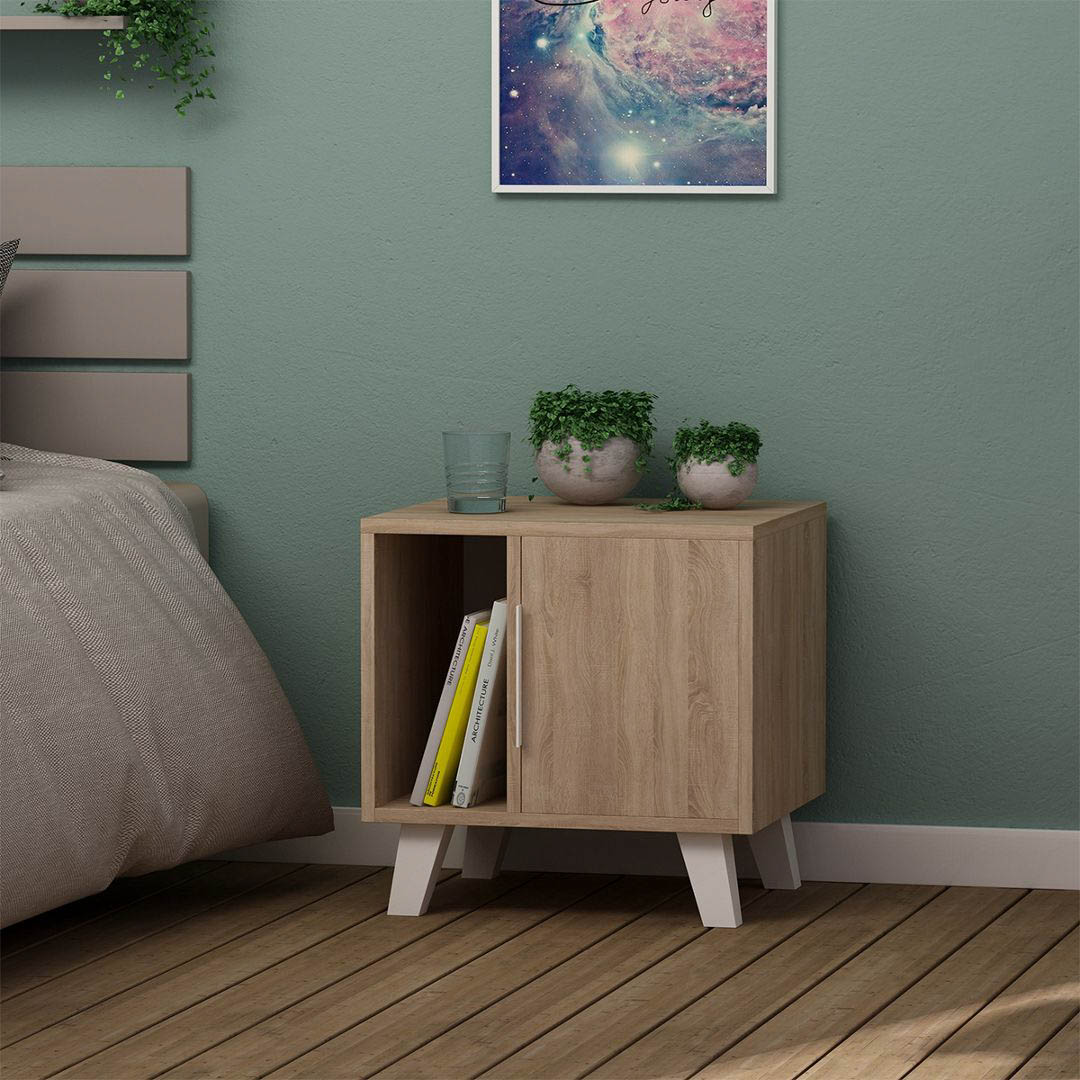 THÔNG TIN SẢN PHẨM - Tên sản phẩm: Tab đầu giường phong cách Nordic - Chất liệu: Gỗ MDF phủ melamin, chân gỗ sồi tự nhiên - Màu sắc: Trắng - Vân gỗ - Cấu