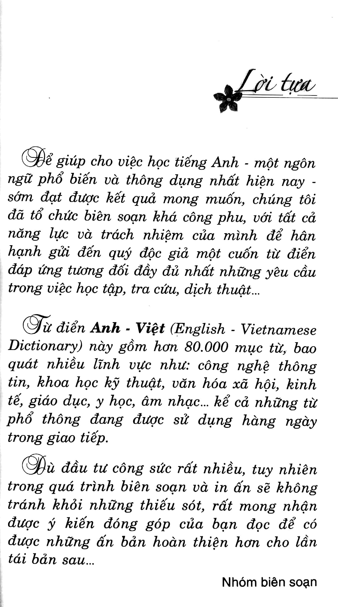 Từ Điển Anh - Việt Trên 135.000 Từ (Bìa Cứng) (Tái Bản Lần 4) Nhằm đáp ứng nhu cầu học tiếng Anh đa dạng của nhiều người. Nhóm chúng tôi đã biên soạn cuốn từ
