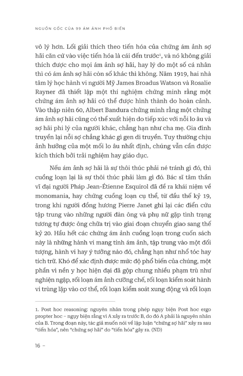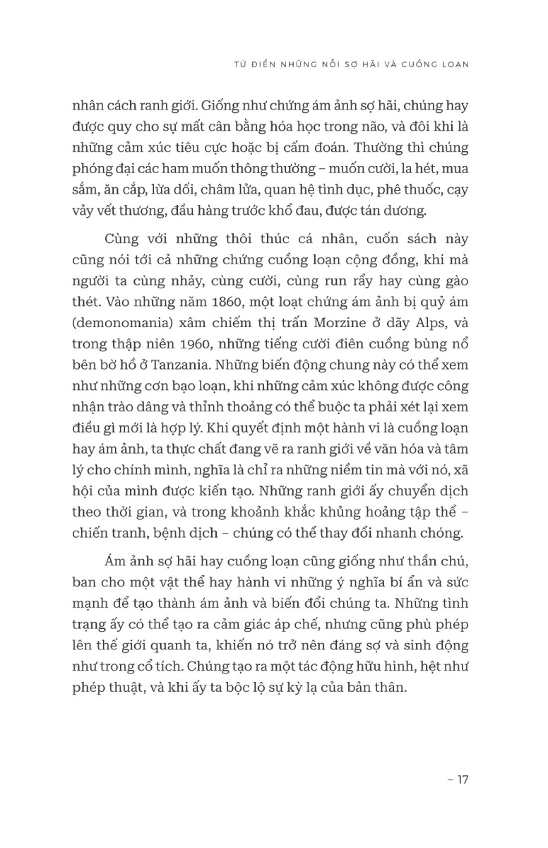 - Publishers Weekly MỘT SỐ TRÍCH ĐOẠN “Các số liệu trên nói về các chứng rối loạn ám ảnh sợ hãi ảnh hưởng đến cuộc sống thường nhật. Nhiều người trong số chúng ta có những cảm giác khó chịu hay sợ hãi nhẹ hơn mà đôi khi lầm tưởng là ám ảnh sợ hãi: cực kỳ không thích nói trước đám đông, đi gặp nha sĩ, nghe tiếng sấm sét hoặc nhìn thấy nhện. Ở Mỹ, có hơn 70% người nói rằng họ có một nỗi sợ vô cớ. Khi bắt đầu nghiên cứu để viết cuốn sách này, tôi không nghĩ rằng mình có chứng sợ hãi cụ thể nào – ngoại trừ nỗi sợ việc bị đỏ mặt khi còn niên thiếu và cảm giác lo lắng thường trực về việc đi máy bay –nhưng đến thời điểm cuốn sách hoàn thành, tôi đã thuyết phục bản thân rằng mình có gần như tất cả những ám ảnh sợ hãi đó. Một số nỗi sợ cảm nhận được ngay khi ta hình dung tới.” “Các nhà tâm lý học tiến hóa tranh luận rằng nhiều chứng ám ảnh sợ hãi mang tính thích nghi: nỗi sợ độ cao và loài rắn được in hằn trong não bộ để ngăn ta ngã từ trên cao hoặc bị rắn cắn; sự ghê tởm với chuột và ốc sên bảo vệ ta khỏi bệnh tật. Các chứng ám ảnh sợ hãi như vậy là một phần di sản tiến hóa của loài người, những nỗi sợ “được chuẩn bị sẵn về mặt sinh học” được thiết kế để bảo vệ ta khỏi các mối đe dọa bên ngoài. Phản ứng với ám ảnh sợ hãi phần nào giống những phản xạ mang tính bản năng. Khi phát hiện đối tượng hay tình huống là mối đe dọa, bộ não nguyên thủy sẽ giải phóng các hóa chất giúp ta chiến đấu hoặc bỏ trốn, và phản ứng thể chất của ta – rùng mình hay chùn bước, đổ mồ hôi hay buồn nôn – dường như xâm chiếm lấy ta.” “Khi quyết định một hành vi là cuồng loạn hay ám ảnh, ta thực chất đang vẽ ra ranh giới về văn hóa và tâm lý cho chính mình, nghĩa là chỉ ra những niềm tin mà với nó, xã hội của mình được kiến tạo. Những ranh giới ấy chuyển dịch theo thời gian, và trong khoảnh khắc khủng hoảng tập thể – chiến tranh, bệnh dịch – chúng có thể thay đổi nhanh chóng.” “Ám ảnh sợ hãi hay cuồng loạn cũng giống như thần chú, ban cho một vật thể hay hành vi những ý nghĩa bí ẩn và sức mạnh để tạo thành ám ảnh và biến đổi chúng ta. Những tình trạng ấy có thể tạo ra cảm giác áp chế, nhưng cũng phù phép lên thế giới quanh ta, khiến nó trở nên đáng sợ và sinh động như trong cổ tích. Chúng tạo ra một tác động hữu hình, hệt như phép thuật, và khi ấy ta bộc lộ sự kỳ lạ của bản thân.”