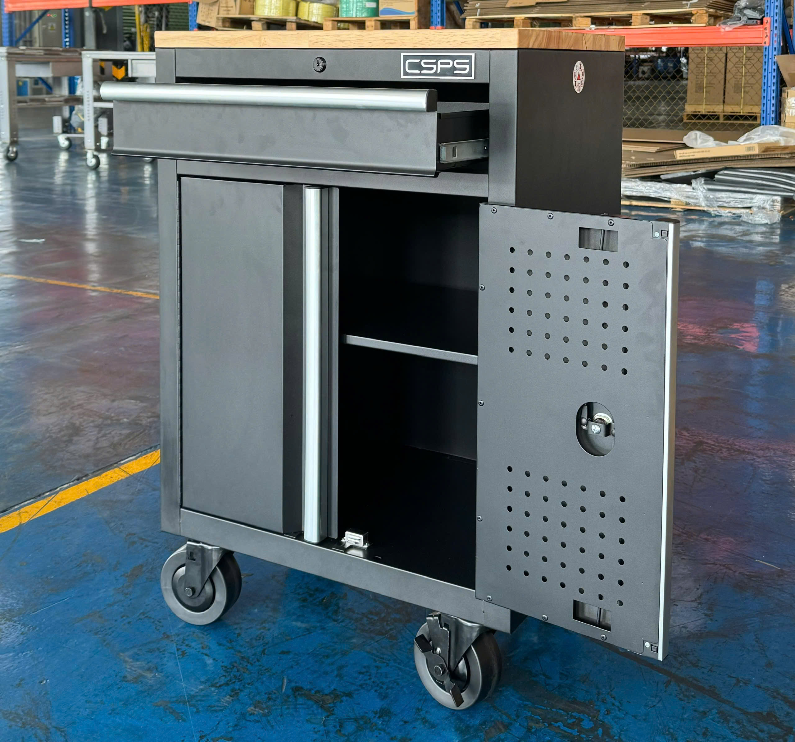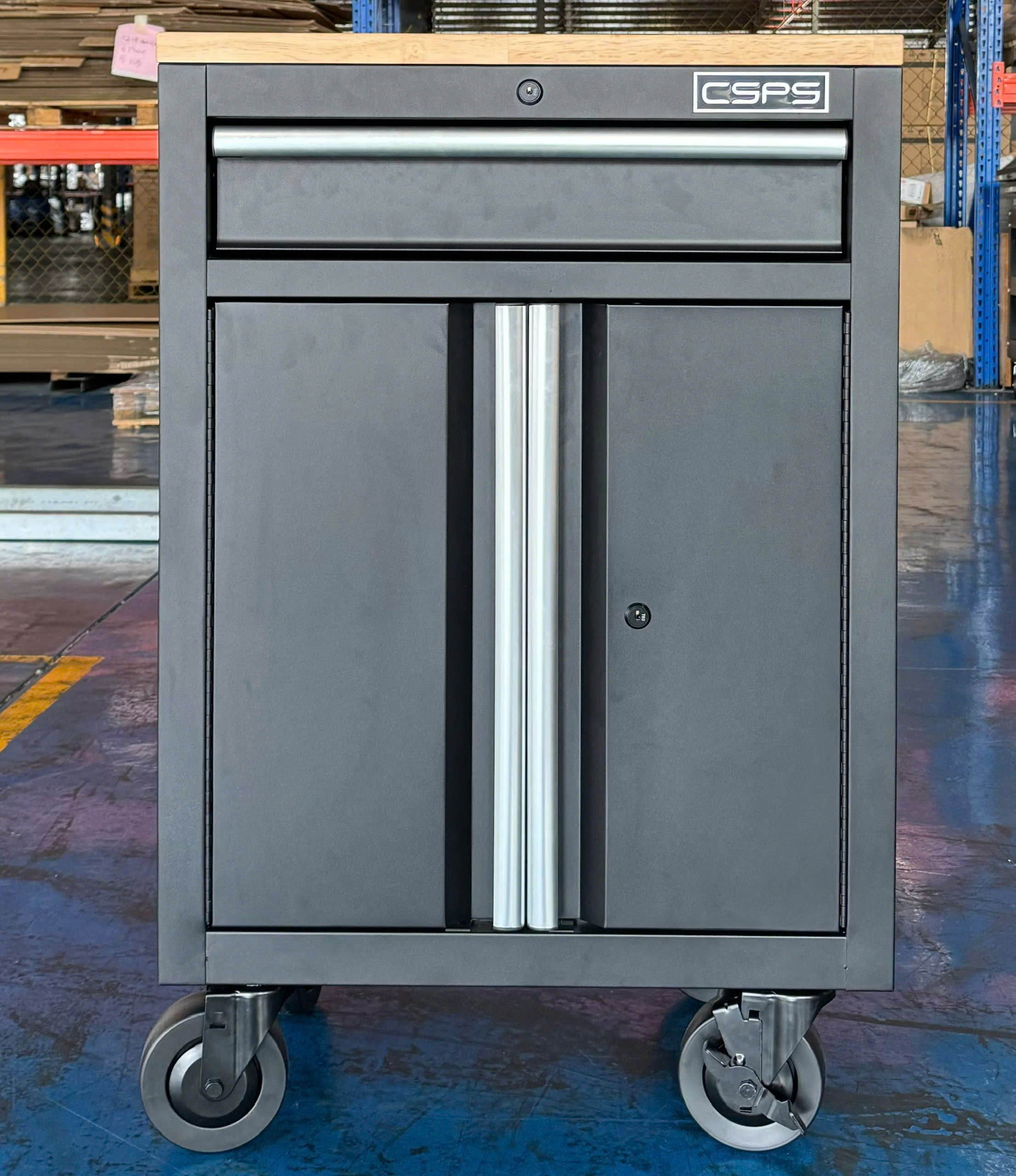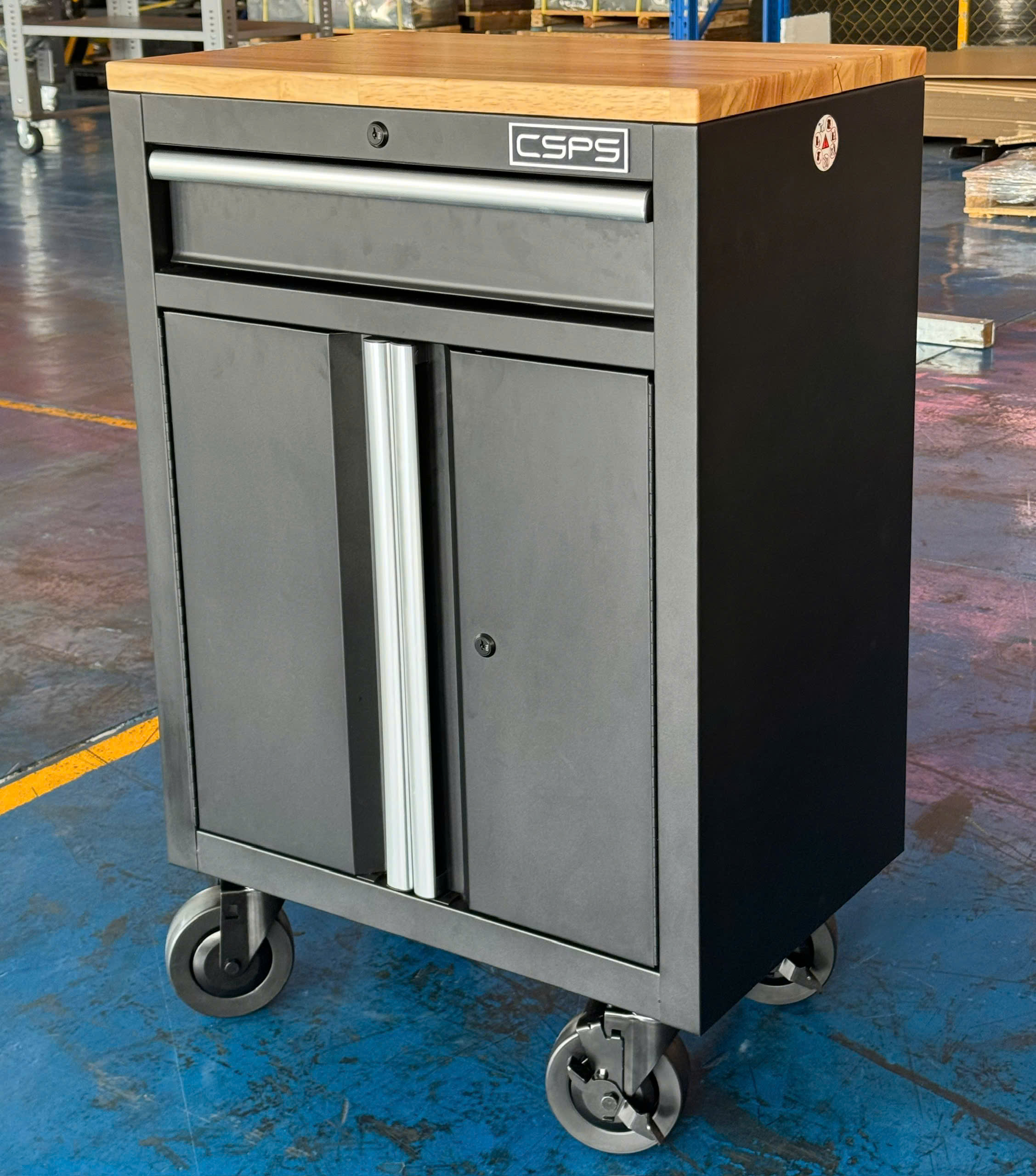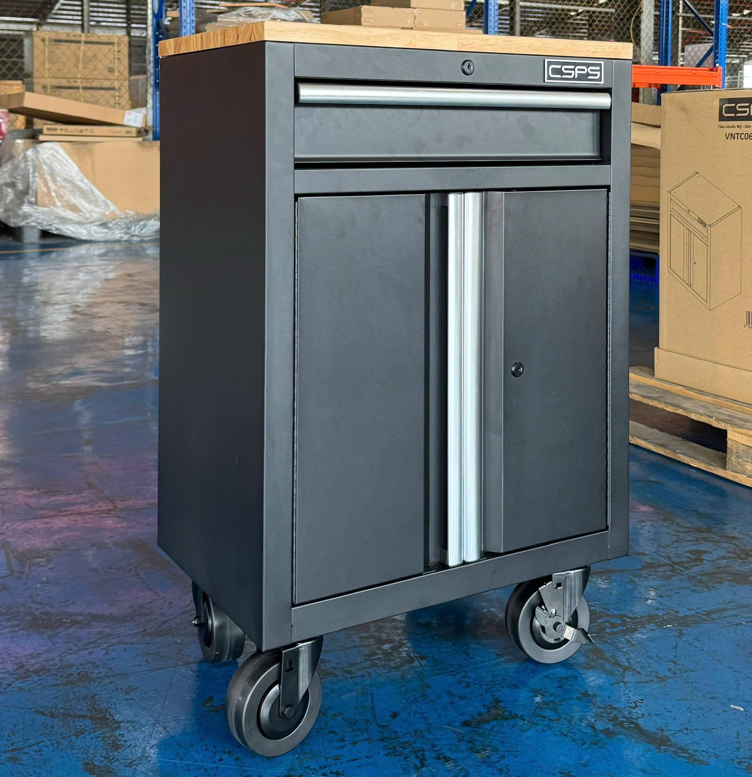 Tủ dụng cụ CSPS 61cm - 01 hộc kéo màu đen bánh xe ván gỗ (tay cầm trắng)