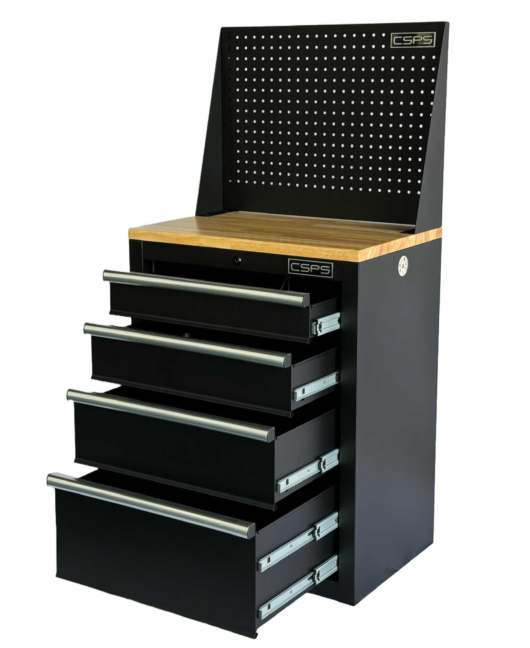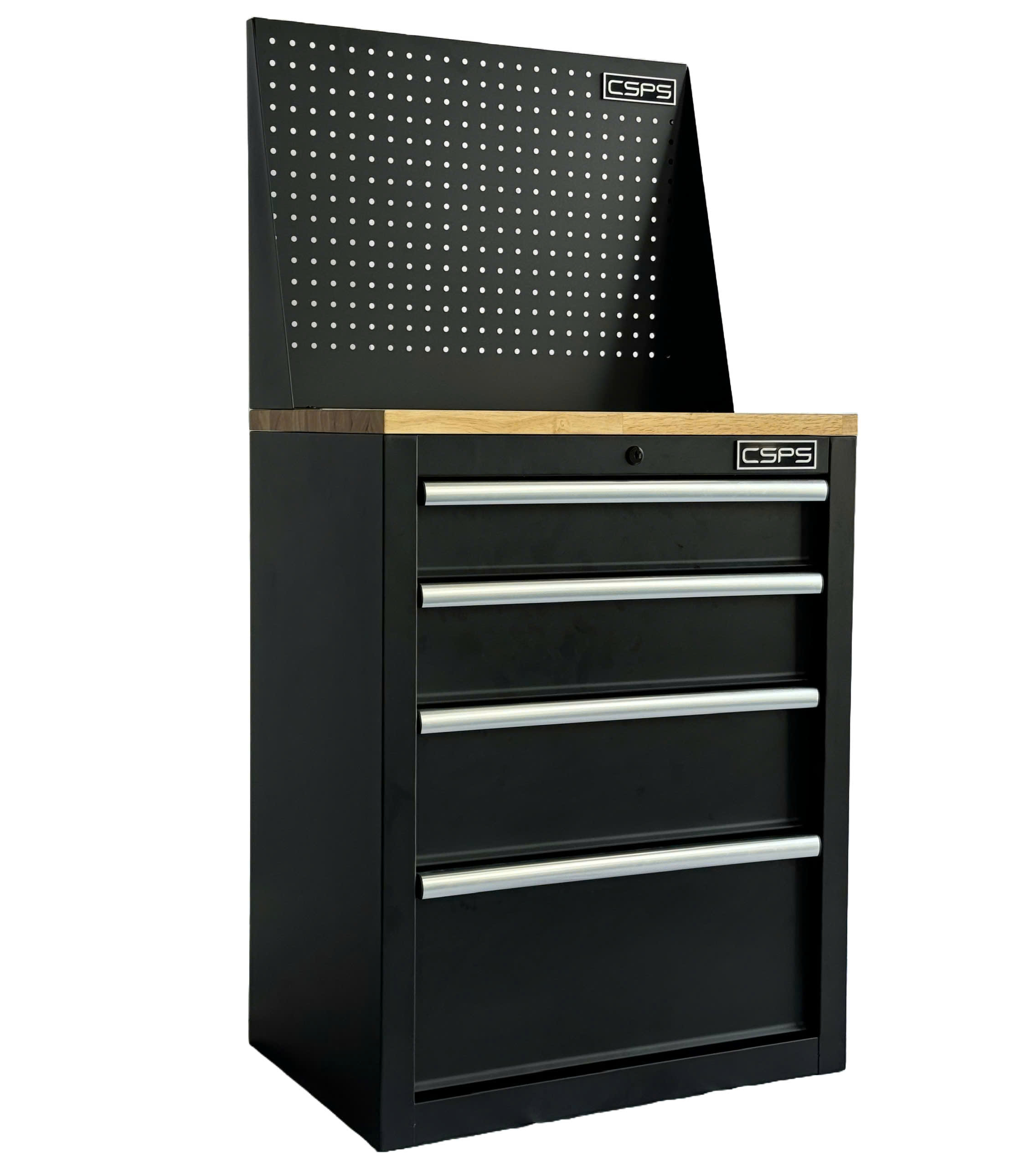 ✨Tủ dụng cụ CSPS 61cm - 04 hộc kéo màu đen ván gỗ vách lưới (tay cầm trắng)