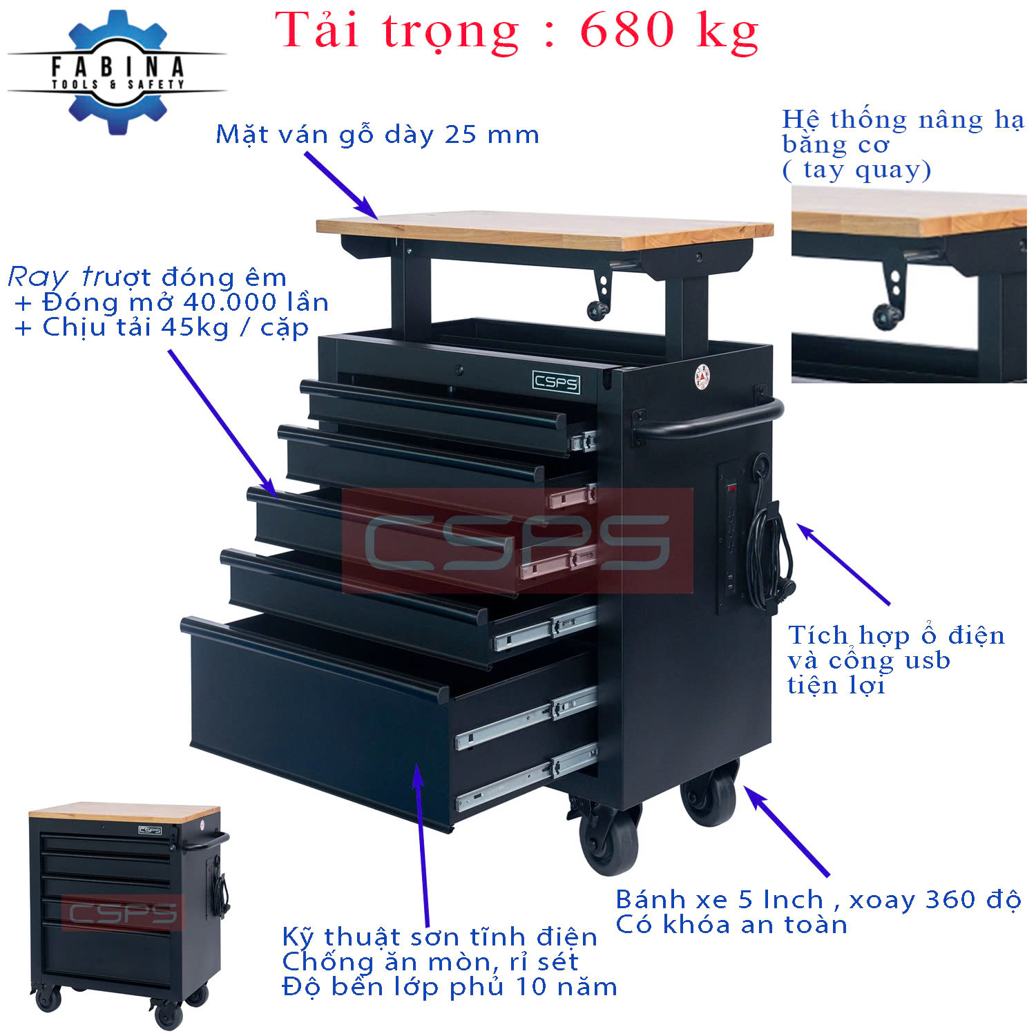Tủ dụng cụ CSPS 84cm - 04 hộc kéo Kích thước sử dụng: 84cm Rộng x 51cm Sâu x 101cm Cao Khối lượng sử dụng: 52.9 kg Tổng chịu tải: 320 kg Ngăn kéo: 04 ngăn,