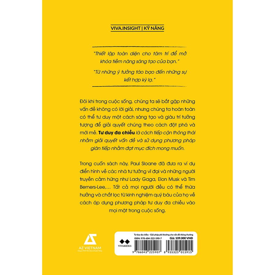Trong cuốn sách này, Paul Sloane đã đưa ra ví dụ điển hình về các nhà tư tưởng vĩ đại và những người truyền cảm hứng như Lady Gaga, Elon Musk và Tim Berners-Lee, Tất cả mọi người đều có thể thừa hưởng và chắt lọc từ kinh nghiệm quý báu của họ về cách áp dụng phương pháp tư duy đa chiều vào mọi mặt trong cuộc sống.