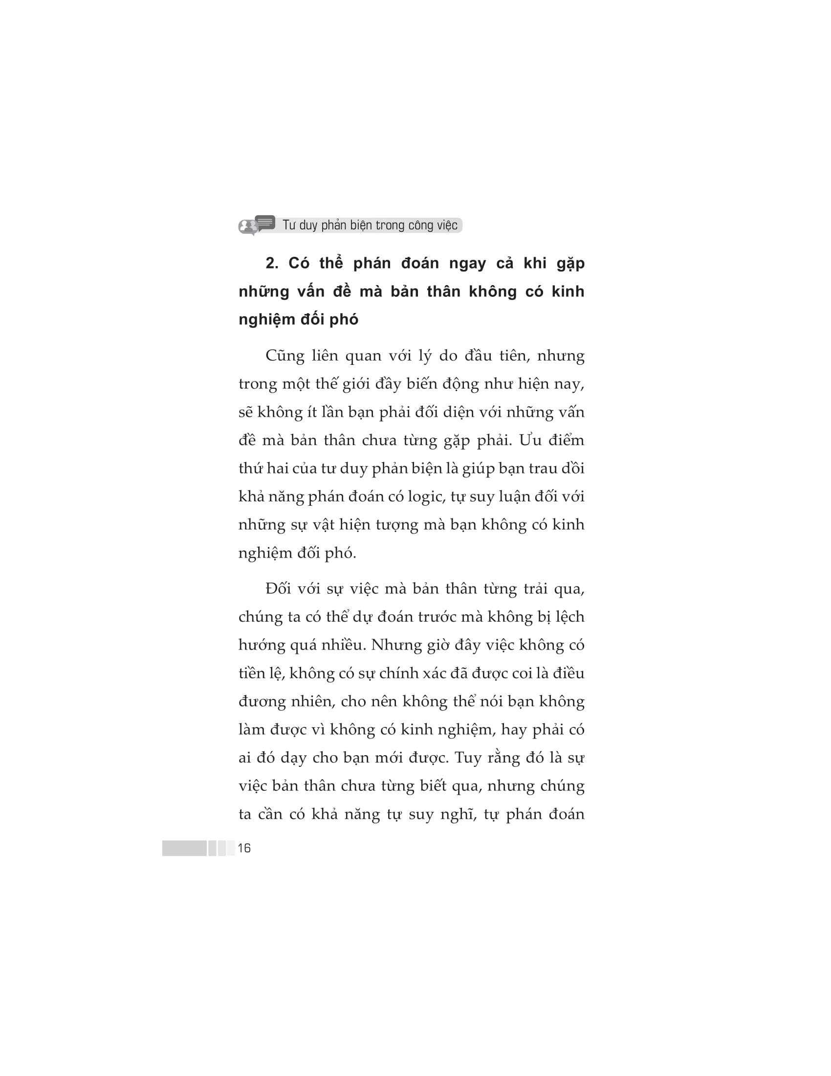 Cuốn sách “Tư duy phản biện trong công việc” sẽ là một công cụ tư duy có chiến lược giúp bạn đạt được những mục tiêu đã đặt ra, cung cấp cho bạn kỹ năng kinh doanh có thể tồn tại ở bất kỳ môi trường nào hay quốc gia nào. Cuốn sách là tập hợp những bài học được dạy trong thực tế, bao gồm các bài luyện tập xác định mục tiêu, làm rõ vấn đề còn tồn tại và suy nghĩ chiến lược để giải quyết vấn đề xoanh quanh vấn đề “Tư duy phản biện”.