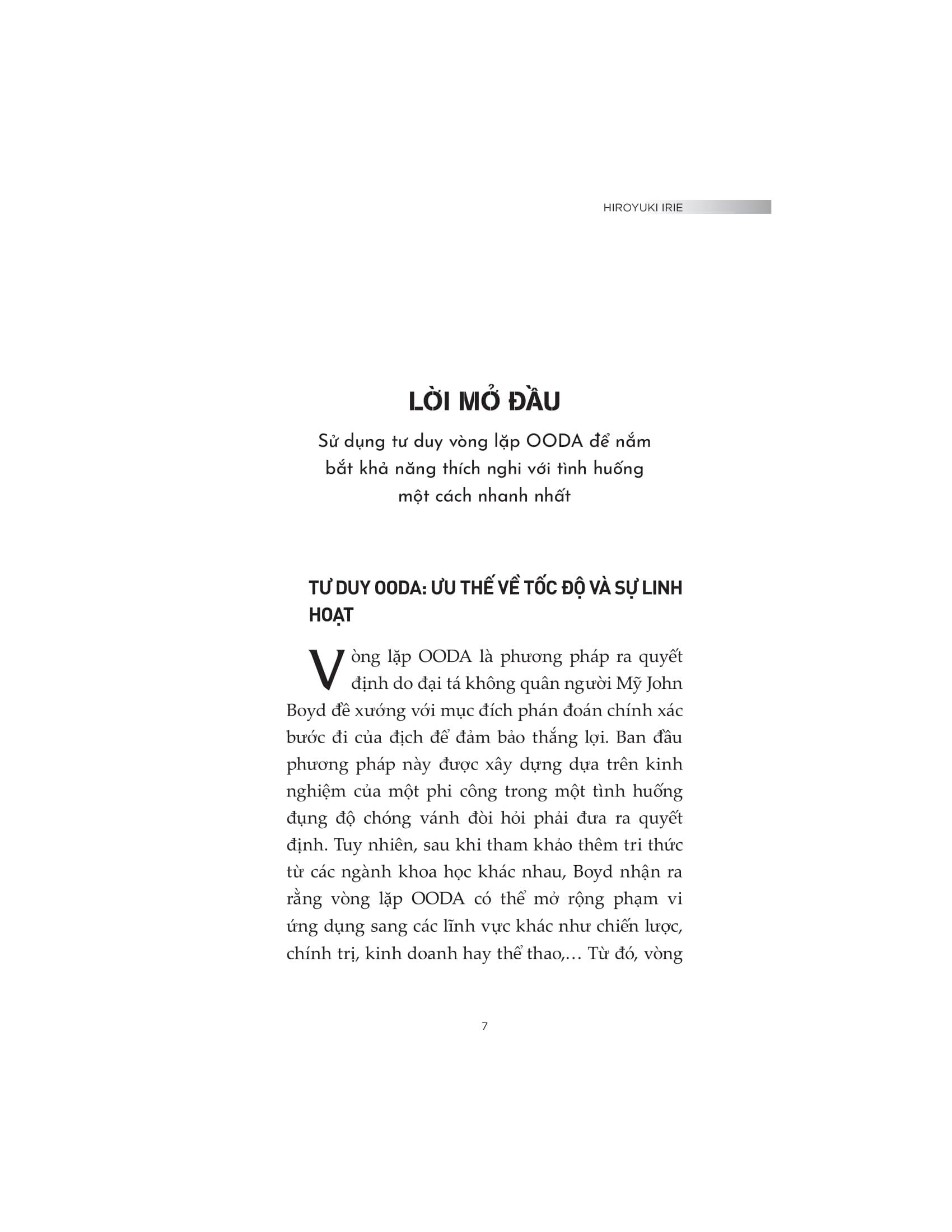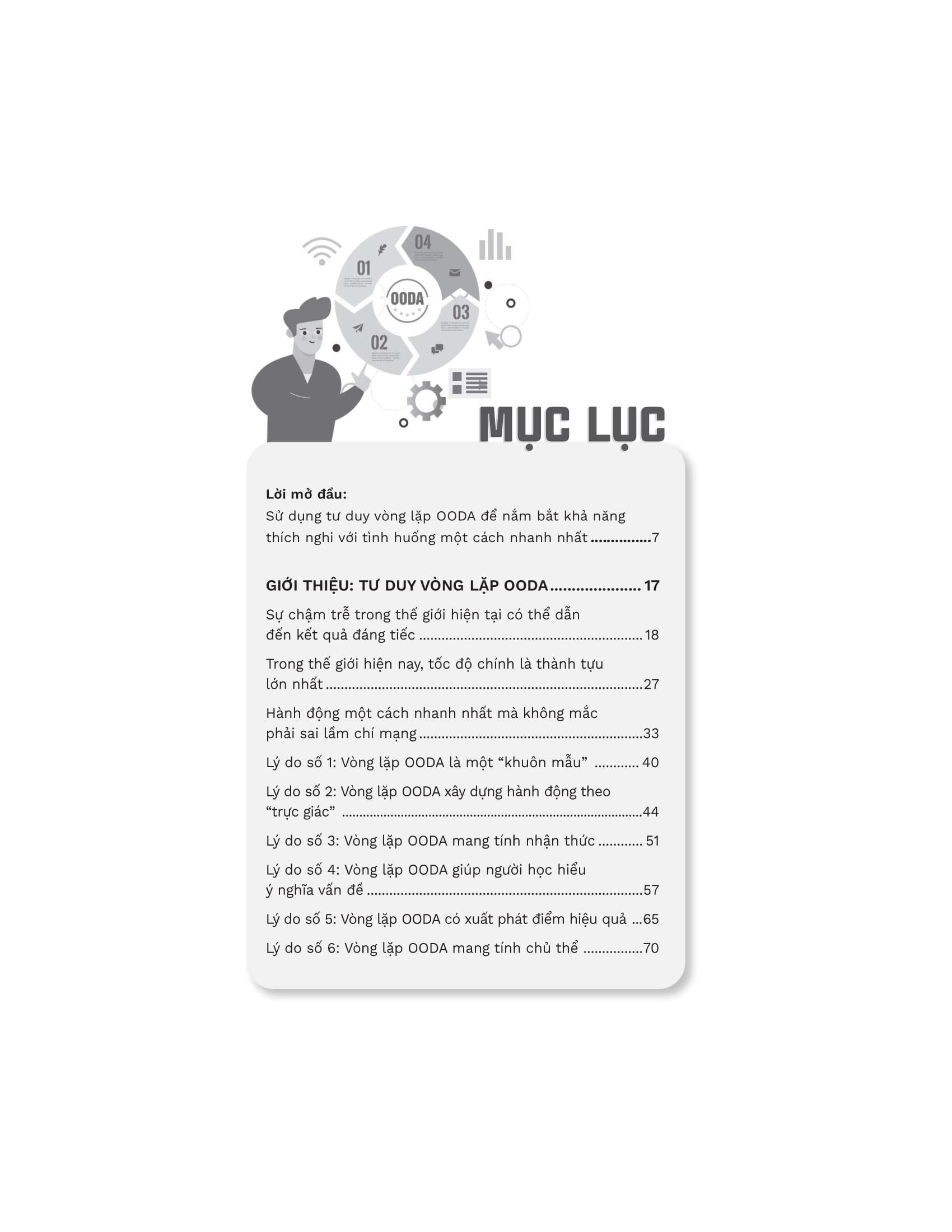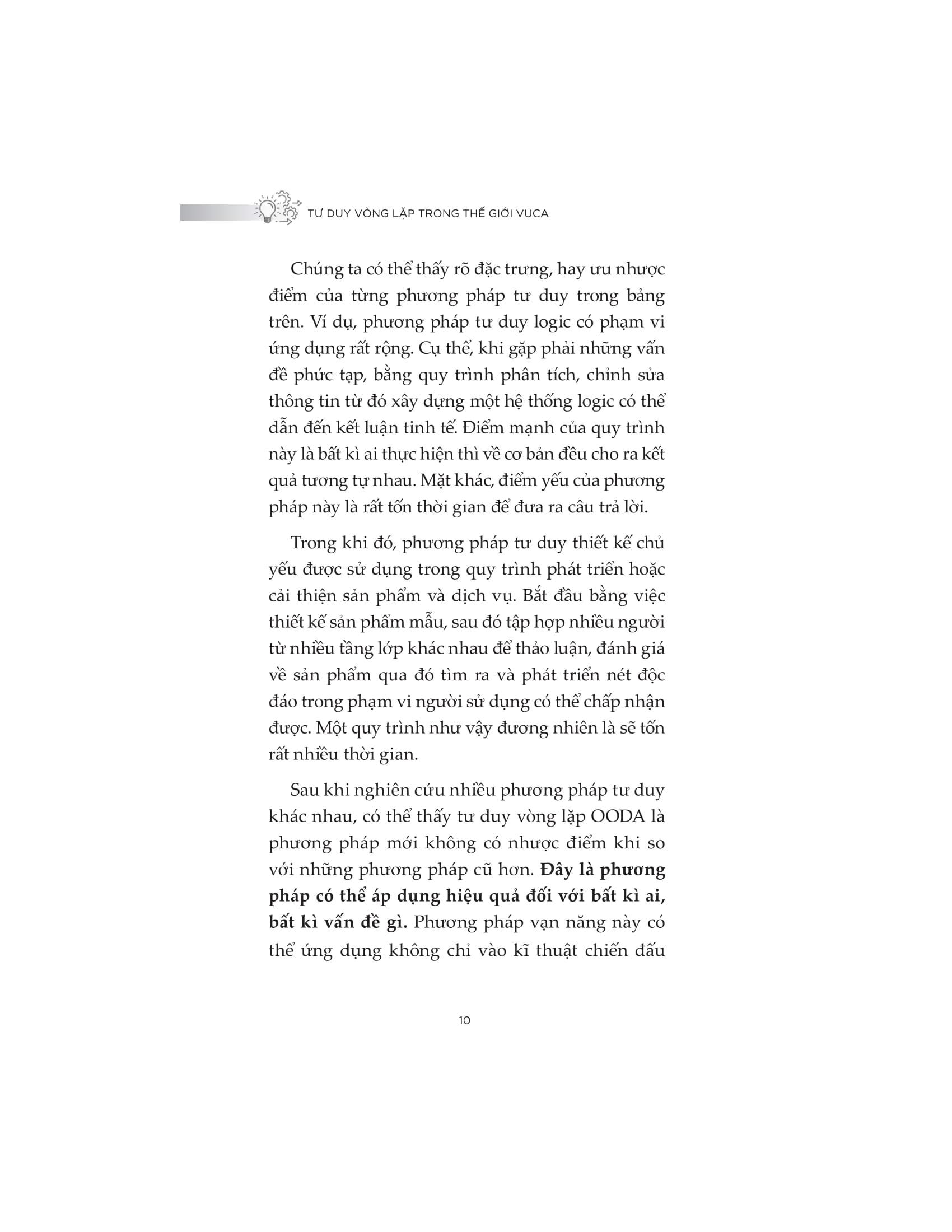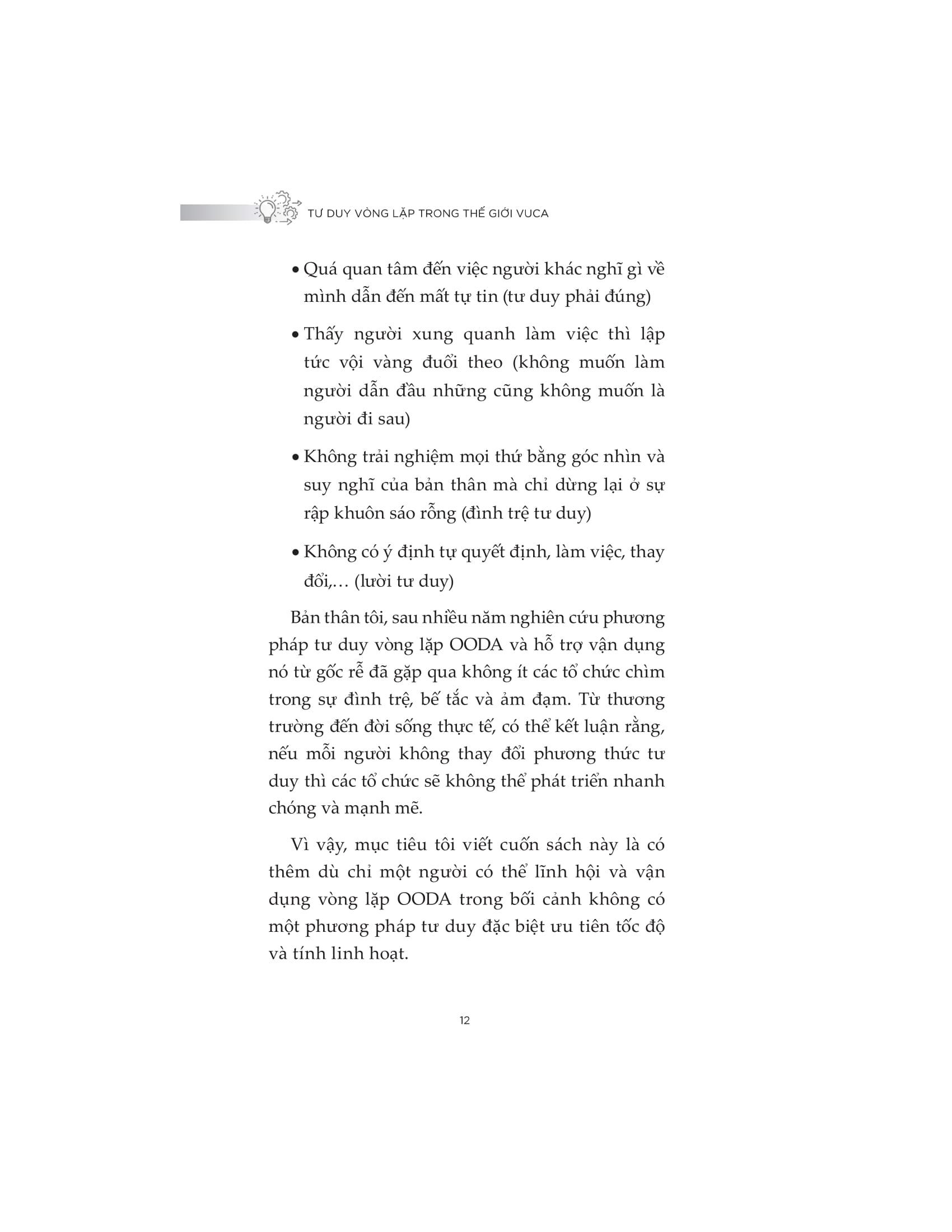 Cuốn sách “Tư duy vòng lặp trong thế giới VUCA” hướng dẫn các “lối tắt” giúp ứng dụng vòng lặp OODA vào các tình huống thực tiễn một cách linh hoạt và hiệu quả, nó chắc chắn mang lại lợi ích đủ lớn để bạn từ bỏ lối tư duy thông thường của m.ình sang một lối tư duy "thần tốc" hơn. Thông qua những câu chuyện thực tế đi kèm nhiều ví dụ minh họa, bạn sẽ hiểu rõ việc áp dụng tư duy vòng lặp OODA vào bối cảnh công việc để đánh giá tình huống, nhìn nhận vấn đề, ra quyết định và hành động nhanh chóng.