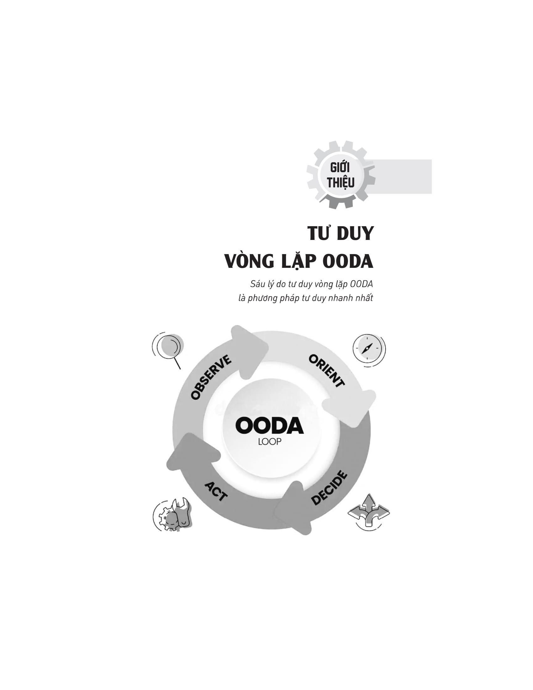 Với OODA, bạn sẽ giành được ưu thế tuyệt đối về tốc độ và sự linh hoạt để giải quyết các tình huống phát sinh trong công việc cũng như cuộc sống hằng ngày. Vòng lặp OODA đã được công nhận ở Âu Mỹ là phương pháp tư duy hiệu quả để đạt được mục đích nhanh chóng bằng phán đoán và ra quyết định chính xác dưới bất kỳ hoàn cảnh nào.