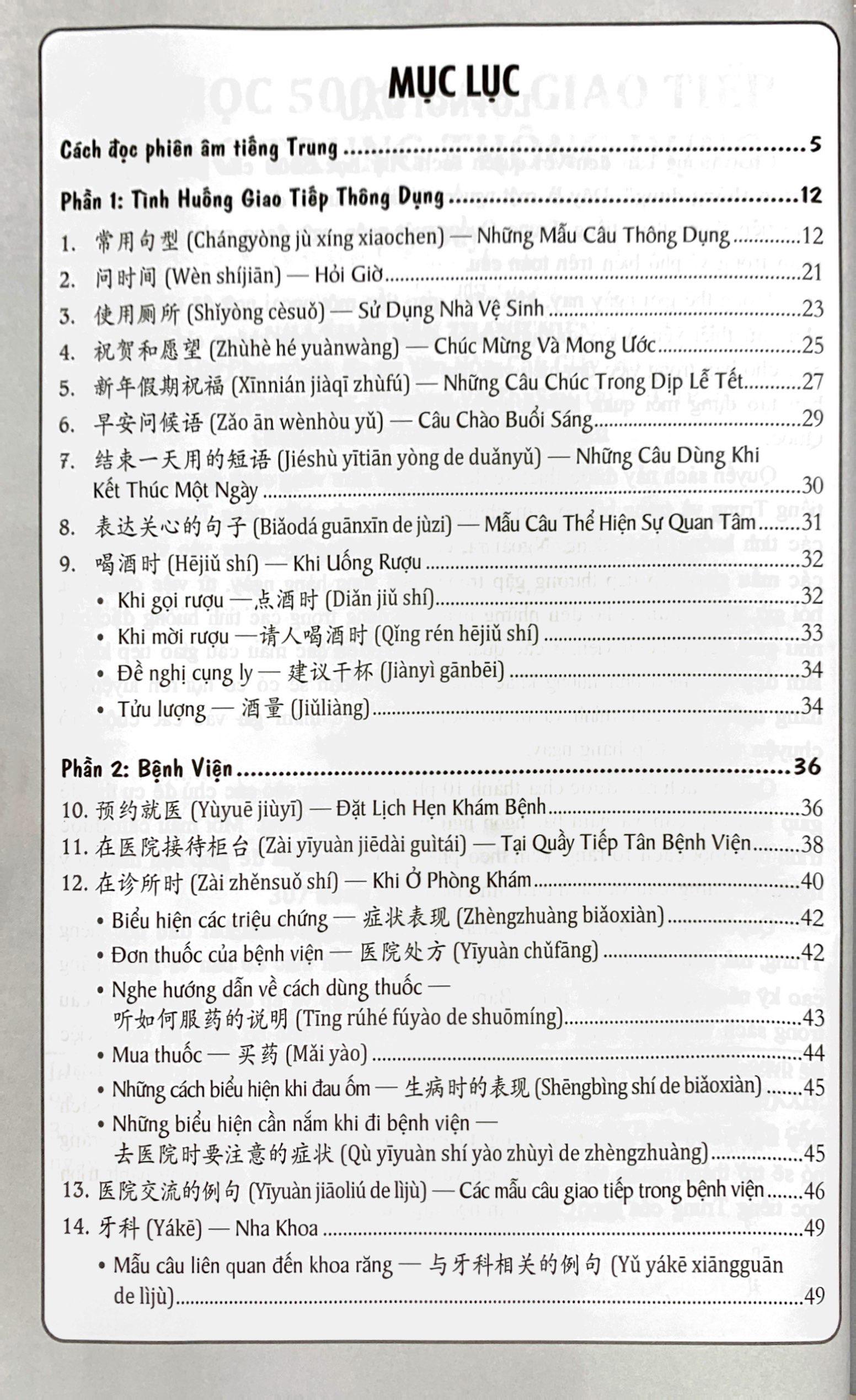 Quyển sách này được chia thành 10 phần, tập trung vào các chủ đề cụ thể để giúp bạn tiếp cận và nắm bắt ngôn ngữ một cách dễ dàng. Mỗi mẫu câu được trình bày một cách rõ ràng, kèm theo phiên âm và ý nghĩa để giúp bạn hiểu rõ ý nghĩa của từng câu và cách phát âm chính xác.