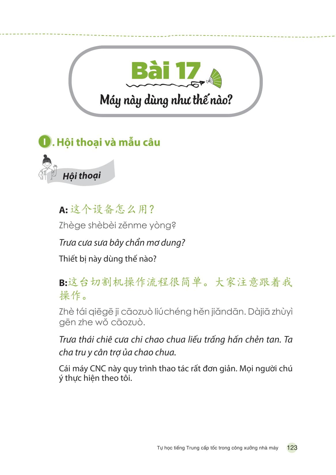 Cuốn sách “Tự học Tiếng Trung cấp tốc trong công xưởng, nhà máy” ra đời cũng vì mục đích đó. Với các chủ đề đa dạng, từ giao tiếp thông dụng tới giao tiếp theo chuyên ngành, cuốn sách sẽ phù hợp cho nhiều đối tượng khác nhau, đặc biệt là những người bận rộn muốn học tiếng Trung có trọng điểm, tiết kiệm thời gian và có thể ứng dụng ngay trong công việc.