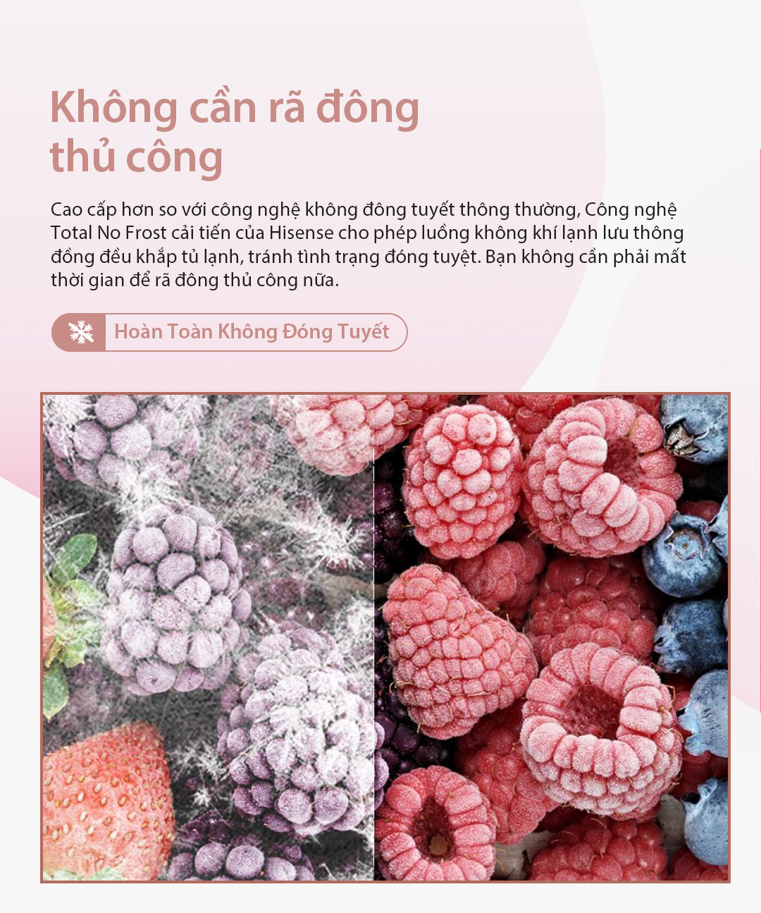 - Hoàn Toàn Không Đóng Tuyết: Cao cấp hơn so với công nghệ không đông tuyết thông thường, Công nghệ Total No Frost cải tiến của Hisense cho phép luồng không khí lạnh lưu thông đồng đều khắp tủ lạnh, tránh tình trạng đóng tuyệt. Bạn không cần phải mất thời gian để rã đông thủ công nữa.