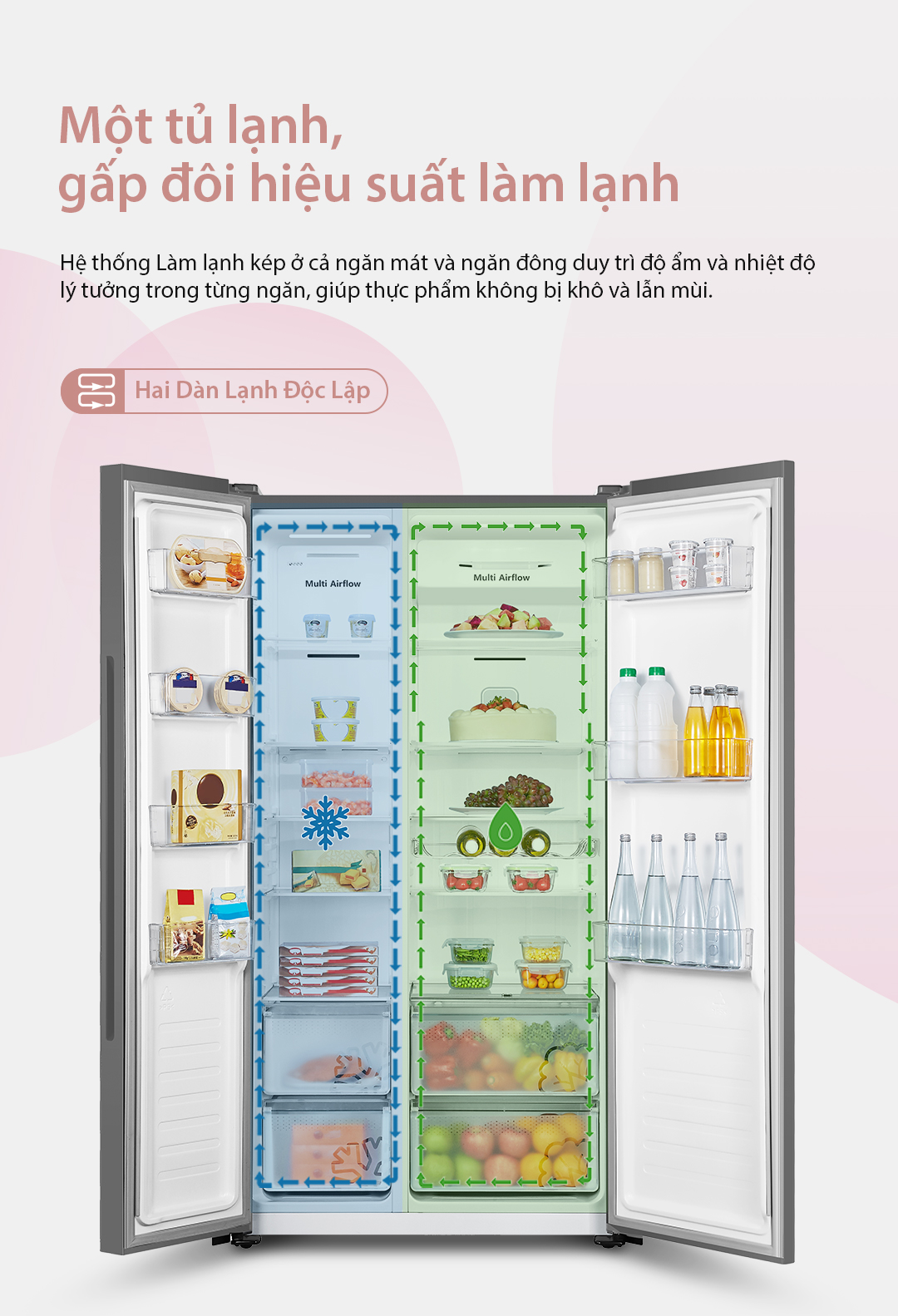 - Hai Dàn Lạnh Độc Lập: Hệ thống Làm lạnh kép ở cả ngăn mát và ngăn đông duy trì độ ẩm và nhiệt độ lý tưởng trong từng ngăn, giúp thực phẩm không bị khô và lẫn mùi.