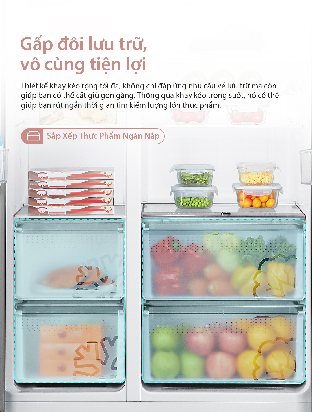 - Gấp Đôi Lưu Trữ, Vô Cùng Tiện Lợi: Thiết kế khay kéo rộng tối đa, không chỉ đáp ứng nhu cầu về lưu trữ mà còn giúp bạn có thể cất giữ gọn gàng. Thông qua khay kéo trong suốt, nó có thể giúp bạn rút ngắn thời gian tìm kiếm lượng lớn thực phẩm.