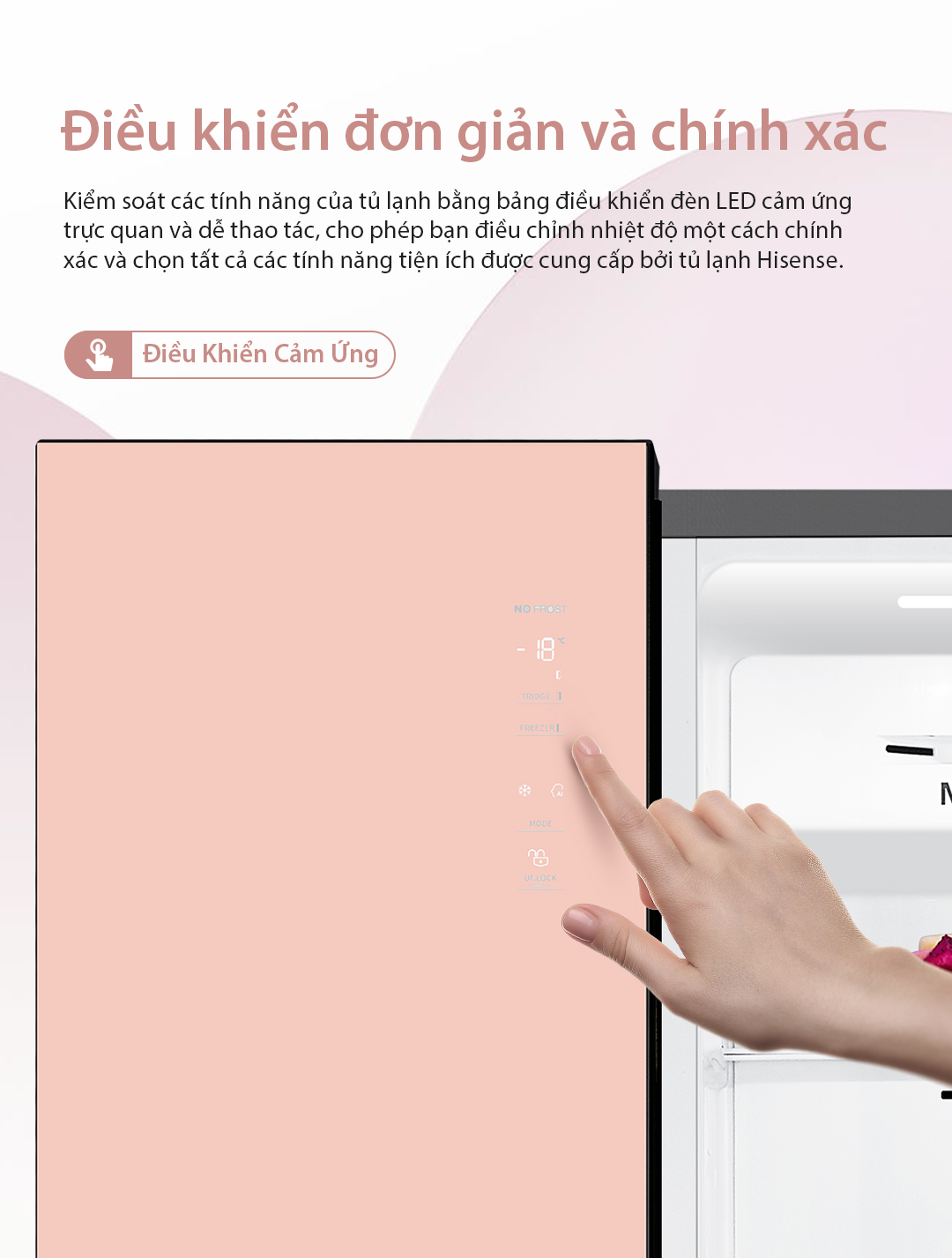- Điều Khiển Cảm Ứng: Kiểm soát các tính năng của tủ lạnh bằng bảng điều khiển đèn LED cảm ứng trực quan và dễ thao tác, cho phép bạn điều chỉnh nhiệt độ một cách chính xác và chọn tất cả các tính năng tiện ích được cung cấp bởi tủ lạnh Hisense.