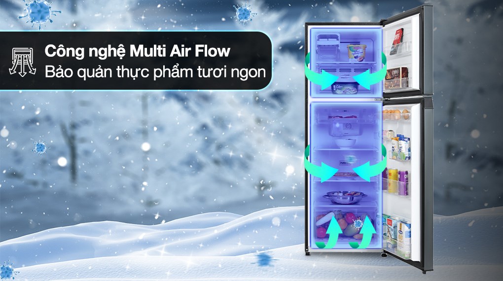 - Hộp làm đá gồm có vỉ đá xoay và hộp chứa đá phía dưới tiện lợi cho việc bảo quản. Ngăn lạnh Ngăn lạnh có dung tích 172 lít, gồm có 1 ngăn Cooling Zone 0°C, 2 kệ chia làm 3 ngăn và 1 ngăn đựng rau củ quả. Bên cửa tủ lạnh còn được thiết kế thêm 5 khay chứa. Công nghệ tiết kiệm điện : Nhờ kết hợp việc sử dụng quạt Inverter và máy nén, công nghệ Origin Inverter có thể duy trì độ lạnh ổn định bên trong ngăn tủ mà vẫn đảm bảo này sử dụng điện tiết kiệm và vận hành êm ái nhất có thể. Công nghệ làm lạnh + Công nghệ bảo quản thực phẩm - : Giúp khí lạnh được phân bổ và lan tỏa đều khắp các ngóc ngách bên trong tủ. Từ đó góp phần làm lạnh toàn diện và duy trì độ tươi ngon của thực phẩm tốt hơn. - Công nghệ Multi Air Flow: Khí lạnh được tỏa ra vừa đủ để phân bổ đến mọi vị trí bên trong giữa các ngăn tủ. Nhờ đó kéo dài thời gian bảo quản thực phẩm lâu hơn cũng như hạn chế tình trạng hơi lạnh không được tỏa đồng đều giữa các ngăn. - Ngăn Cooling Zone 0°C: Ngăn giúp cấp đông thực phẩm tươi sống nhanh chóng trên bề mặt. Bạn có thể chế biến nhanh chóng mà không cần thời gian chờ rã đông. Hơn nữa, ngăn đông này còn phù hợp cho việc bảo quản các nhóm thực phẩm đồ uống, bánh kẹo, phô mai,… và mỹ phẩm ở nhiệt độ 0°C ổn định. Công nghệ kháng khuẩn khử mùi : Được cấu tạo từ gốm Ceramic và phủ lớp tinh thể Bạc (Ag+) nên bộ lọc này có khả năng diệt khuẩn và khử mùi hôi thực phẩm hiệu quả. Nhờ vậy góp phần làm cho không gian bên trong luôn được thông thoáng và bảo quản thực phẩm tốt hơn. Bảng điều khiển Bảng điều khiển được bố trí bên trong mỗi ngăn (ngăn đá và ngăn lạnh riêng). Trong đó, bảng điều khiển ở ngăn đá có dạng nút trượt còn ở ngăn lạnh thì có dạng núm vặn, giúp cho người dùng dễ dàng thao tác mỗi khi có nhu cầu cài đặt nhiệt độ. Tóm lại, Toshiba Inverter 233 lít GR-RT303WE-PMV(52) có kiểu dáng tủ lạnh ngăn đá trên quen thuộc nhưng sở hữu màu sắc đen Sapphire tinh tế, phù hợp với không gian nhà bếp hiện đại. Tủ lạnh còn được thiết kế ngăn Cooling Zone 0°C giúp người dùng có thể chế biến thực phẩm tươi sống nhanh chóng mà không cần chờ rã đông quá lâu, thậm chí có thể bảo quản nhiều thực phẩm đông lạnh với dung tích ngăn đá lớn.