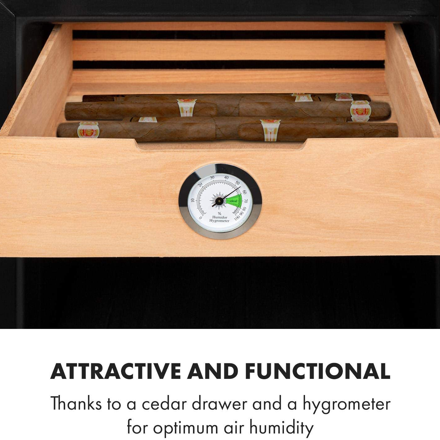 Trong nội thất 89 lít, CIGAR có thể được lưu trữ trong bốn ngăn kéo rộng rãi làm bằng gỗ tuyết tùng. Ba kệ lưu trữ ở khu vực phía trên cho phép lưu trữ tối đa 9 chai rượu vang. Đường ray chạy trơn tru cho phép truy cập nhanh chóng và dễ dàng. Máy đo độ ẩm tích hợp giúp dễ dàng duy trì độ ẩm lý tưởng – để CIGAR không bị khô và giữ nguyên hương vị.