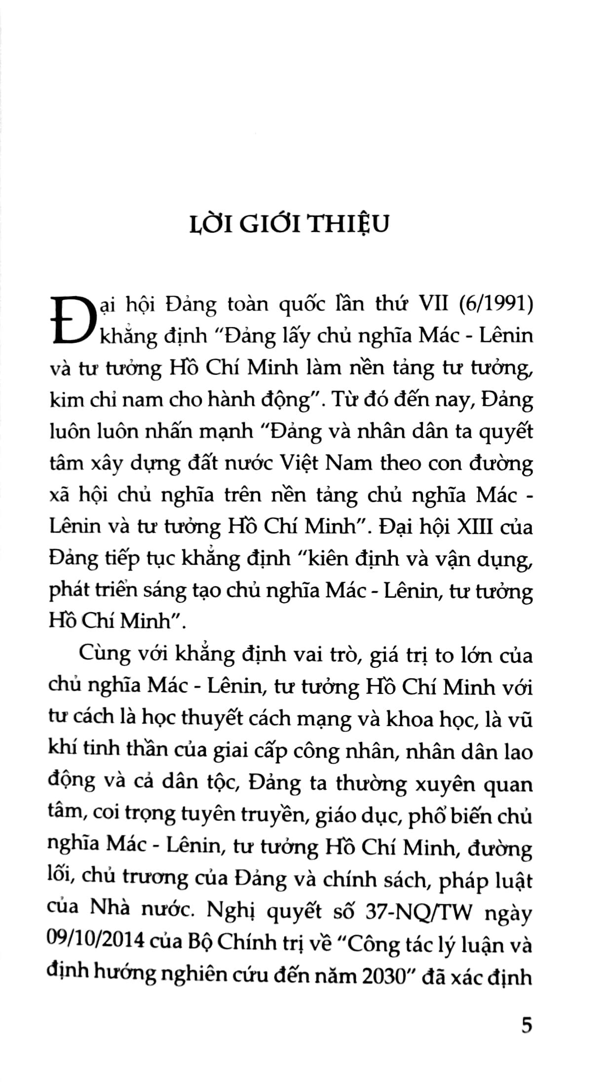 Tủ Sách Thường Thức Chính Trị - Thường Thức Về Tư Tưởng Hồ Chí Minh Đại hội Đảng toàn quốc lần thứ VII (6/1991) khẳng định “Đảng lấy chủ nghĩa Mác - Lênin và tư tưởng Hồ Chí Minh làm nền tảng tư tưởng kim chỉ nam cho hành động”. Từ đó đến nay, Đảng luôn luôn nhấn mạnh “Đảng và nhân dân ta quyết tâm xây dựng đất nước Việt Nam theo con đường xã hội chủ nghĩa trên nền tảng chủ nghĩa Mác - Lênin và tư tưởng Hồ Chí Minh”. Đại hội XIII của Đảng tiếp tục khẳng định “kiên định và vận dụng phát triển sáng tạo chủ nghĩa Mác - Lênin, tư tưởng Hồ Chí Minh”. Cùng với khẳng định vai trò, giá trị to lớn của chủ nghĩa Mác - Lênin, tư tưởng Hồ Chí Minh với tư cách là học thuyết cách mạng và khoa học, là v.ũ khí tinh thần của giai cấp công nhân, nhân dân lao động và cả dân tộc, Đảng ta thường xuyên quan tâm, coi trọng tuyên truyền, giáo dục, phổ biến chủ nghĩa Mác - Lênin, tư tưởng Hồ Chí Minh, đường lối, chủ trương của Đảng và chính sách, pháp luật của Nhà nước. Nghị quyết số 37-NQ/TW ngày 09/10/2014 của Bộ Chính trị về “Công tác lý luận và định hướng nghiên cứu đến năm 2030” đã xác định.