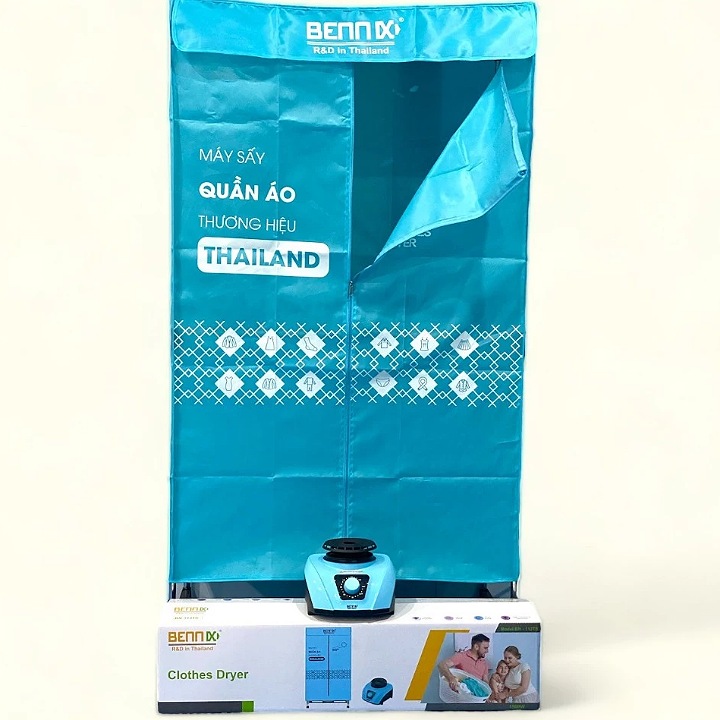Tủ Sấy Quần Áo Bennix BN-115BIG -1800W Vài năm gần đây tủ sấy quần áo Thái Lan thương hiệu Bennix được nhiều gia đình lựa chọn. Sản phẩm có khung chắc chắn, vải bạt tốt, động cơ sấy an toàn, vải bạt bên ngoài không bị vỡ giòn hay rách mủn sau một thời gian sử dụng như loại rẻ tiền đang bán trên thị trường. Mặc dù giá cao hơn một chút so với máy sấy quần áo giá rẻ nhưng lợi ích mang lại lâu dài và yên tâm sử dụng. Khung Inox to Điểm khác biệt lớn nhất của tủ sấy quần áo Thái Lan Bennix BN-115BIG mẫu mới là khung inox cao hơn. Chiều cao sau lắp đặt khoảng 172cm, trong khi các loại đang bán trên thị trường khoảng 150cm. Chiều rộng của tủ 90cm (loại cũ chỉ 70cm). Nhờ đó bạn treo được nhiều đồ hơn. Với các mẫu máy sấy quần áo hiện nay thường sấy khoảng 15kg nhưng Bennix BN-115BIG có thể sấy tối đa 25kg. Các thanh inox cũng to hơn, khi lắp đặt bạn sẽ có cảm giác chắc chắn hơn rất nhiều so với các loại. Khả năng chịu lực tốt. Chất liệu inox không gỉ. Ngoài các thanh chính còn có thêm các thanh phụ nhỏ giúp tăng khả năng tận dụng tối đa bên trong buồng sấy. Khả năng cơ động cao với bánh xe di chuyển. Thiết kế thông minh dễ dàng tháo lắp khi có nhu cầu hoặc không muốn sử dụng khi hết mua. Khung tủ chắc chắn bạn cũng có thể sử dụng thay cho tủ vải đựng quần áo. Vải cao cấp Vải bạt phủ bên ngoài thủ sấy cũng có sự khác biệt đáng kể. Thay vì sử dụng chất liệu pha nhiều, tủ sấy quần áo Bennix BN-115BIG sử dụng loại vải cao cấp. Nhờ đó độ bền tăng lên rấ nhiều. Sản phẩm không bị mục, rách, thoái hóa sau một thời gian sử dụng. Công suất lớn Động cơ của tủ sấy quần áo Bennix BN-115BIG cũng có sự khác biệt rất lớn. Công suất lớn, chất liệu nhự cao cấp và bộ phát nhiệt ổn định giúp duy trì nhiệt độ bên trong buồng sấy tối ưu. Máy sẽ tự động ngắt sau khi hết thời gian để đảm bảo an toàn. Sấy khô nhanh, bảo vệ quần áo Công suất của động cơ tối đa 1800w, nhờ đó máy có thể sấy lượng lớn quần áo nhanh chóng. Thời gian sấy có thể lựa chọn tối đa 3 giờ. Tùy theo lượng quần áo, chấ liệu vải dầy hay mọng bạn có thể chọn lựa thời gian phù hợp. Hệ thống sấy khô kết hợp diệt sạch vi khuẩn và chống nhăn giúp bảo vệ quần áo. Hướng dẫn sử dụng tủ sấy Bennix BN-115BIG Trước tiên bạn cần lắp ráp tủ sấy trước khi sử dụng. Tham khảo qua sách hướng dẫn lắp đặt