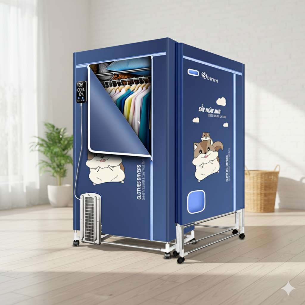 ĐẶC ĐIỂM NỔI BẬT: - Công dụng: làm khô nhanh quần áo, loại bỏ mùi hôi khó chịu, bụi bẩn trên quần áo. - Sử dụng bộ phát điện ổn định PTC, tiết kiệm điện. -