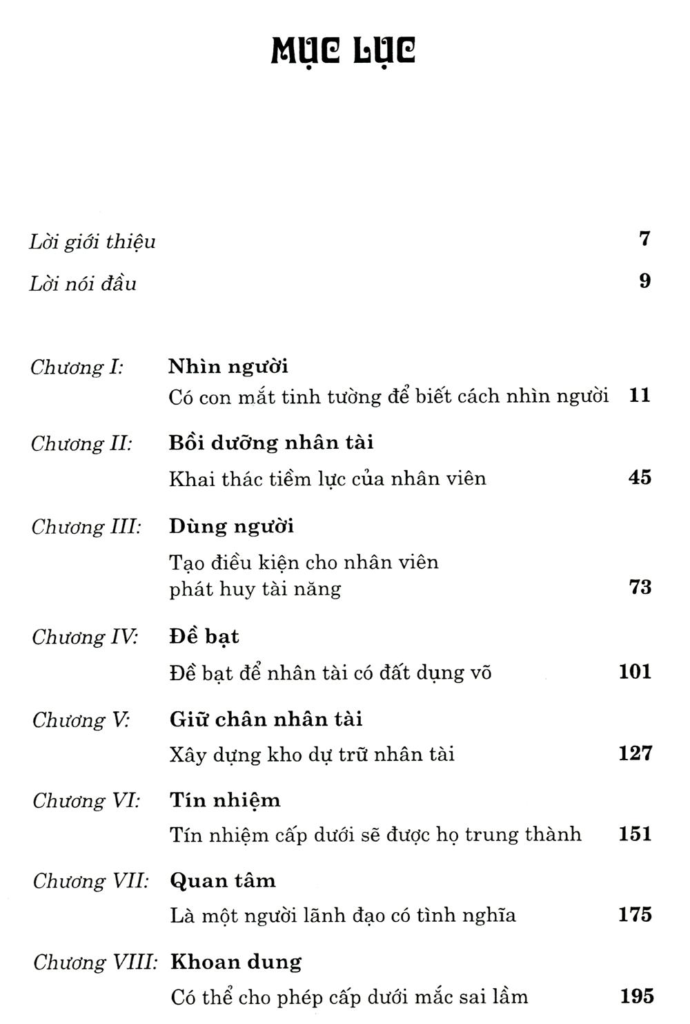 Việc quản lý của người lãnh đạo có nhiều tầng bậc khác nhau, bậc đầu tiên là xây dựng chế độ quản lý để mọi người đều phải tuân theo; bậc tiếp theo là việc dù lớn hay nhỏ, ai nấy cũng đều phải chăm chỉ cần cù; bậc cao hơn nữa là tạo dựng uy quyền, mệnh lệnh đưa ra buộc phải chấp hành; tiếp nữa là làm gương cho cấp dưới làm mọi người đồng tâm nhất trí; cuối cùng là quản lý người theo ý mình nhưng dưới hình thức quản mà như không quản. Cũng giống như một nước đi đúng đắn cứu sống cả ván cờ, một câu nói ấm áp đổi lại sự trung thành, một đôi mắt tinh tường khiến nhân tài kéo về tề tựu, triết lý này tưởng chừng như vô hình nhưng thực ra lại chính là con đường để đi đến thành công trong quản lý con người.