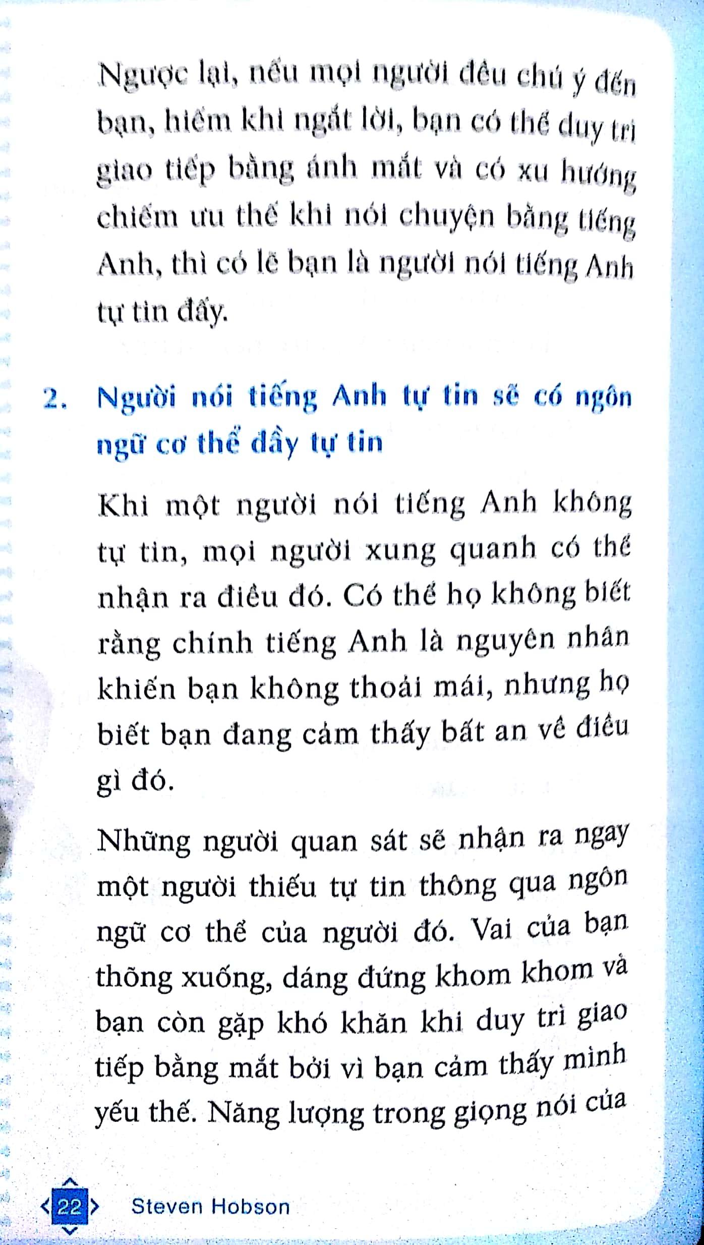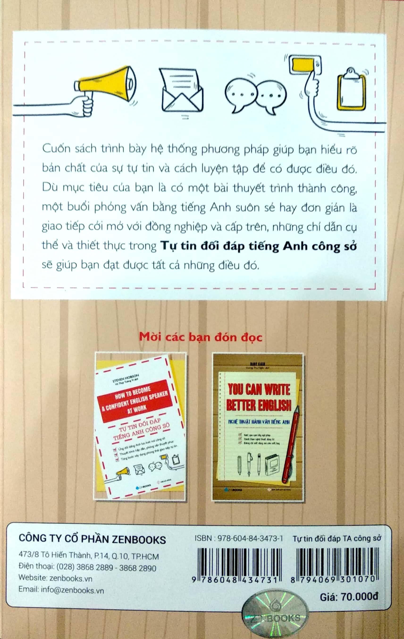 Mua tại TiktokTự tin đối đáp tiếng Anh công sở sẽ giúp bạn nhận thức được sự tự tin quan trọng thế nào với người dùng tiếng Anh như ngôn ngữ thứ hai để giao tiếp. Đồng thời, tác giả Steven Hobson sẽ hướng dẫn từng bước luyện tập cụ thể và thực tế để bạn có được sự tự tin ấy. Dù mục tiêu của bạn là một bài thuyết trình thành công, một buổi phỏng vấn bằng tiếng Anh suôn sẻ hay đơn giản là giao tiếp cởi mở với đồng nghiệp và cấp trên… cuốn sách nhỏ này sẽ giúp bạn thực hiện được tất cả những mục tiêu đó.