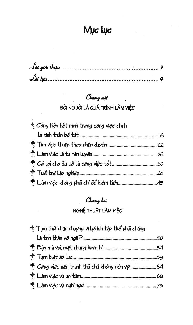 Trong cuốn sách này, Hòa thượng Thích Thánh Nghiêm chia sẻ về việc ứng dụng trí tuệ của giáo lí Phật giáo vào đời sống, nói rõ cho chúng ta biết về ý nghĩa của công việc, nghệ thuật làm việc, phương pháp ứng xử trong giao tiếp cũng như một số nguyên tắc hợp tác đoàn thể, đề xuất quan điểm tìm việc theo tinh thần “tùy thuận nhân duyên” để giảm bớt áp lực trong quá trình tìm kiếm việc làm, lấy “cạnh tranh lành mạnh” thay thế cho cạnh tranh một mất một còn mang đậm “động vật tính”; lấy “nghệ thuật chỉnh dây đàn” theo tinh thần trung không rơi vào cực đoan để giữ thăng bằng tâm lí trong cuộc sống. Cuối cùng, Ngài còn đưa ra sáu nguyên tắc chung sống hòa thuận, đó cũng là những nguyên tắc đã giúp đức Phật “thống lí đại chúng (thống lĩnh và quản lí đại chúng) thích hợp.”