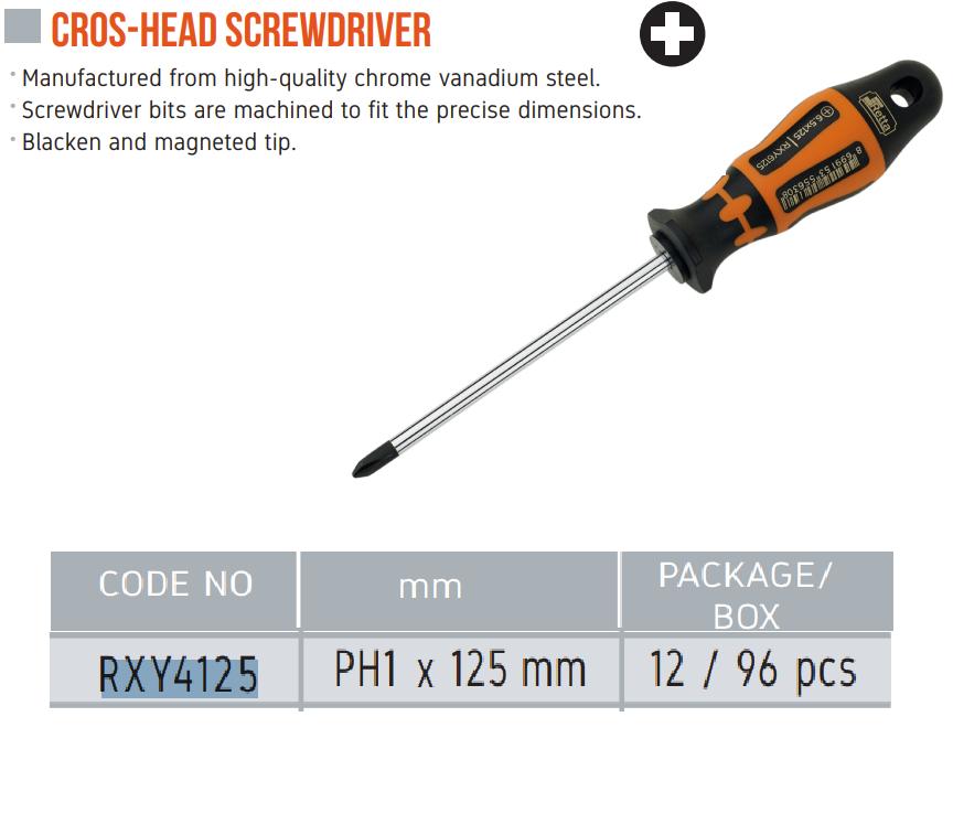 Tua vít 4 cạnh PH1 x 125mm Retta RXY4125 Thổ Nhĩ Kỳ Model:RXY4125 Chiều dài:125mm Là dụng cụ cầm tay, chuyên dùng để vặn, siết đóng ốc vít bằng tay. Sản phẩm được gia công rất tỉ mỉ, đã qua kiểm định nghiêm ngặt, đáp ứng được những yêu cầu về kỹ thuật, chất lượng, đảm bảo sự an toàn cho người dùng