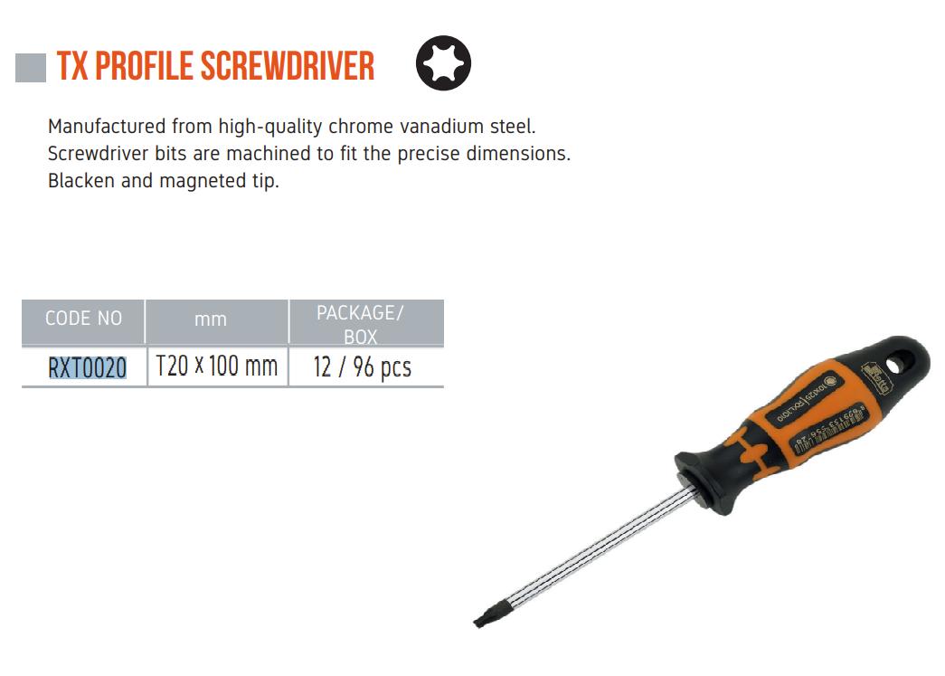 Tua vít đầu sao torx T20 Retta RXT0020 Model:RXT0020 Chiều dài:100mm Là dụng cụ cầm tay, chuyên dùng để vặn, siết đóng ốc vít bằng tay. Sản phẩm được gia công rất tỉ mỉ, đã qua